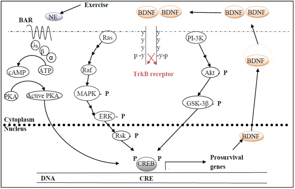 Exercise releases norepinephrine (NE), which binds its GPCR, β-adrenergic receptor (βAR), and then activates cAMP-dependent protein kinase A (PKA), which is only one of many kinases capable of phosphorylating the transcription factor, cAMP-response element binding protein (CREB). Activated CREB is then able to transcribe a wide array of pro-survival genes, one of which is BDNF. The neurotrophin is then packaged into vesicles and released to the extracellular space, where it dimerizes before binding to its receptor, TrkB, which also dimerizes upon ligand binding. TrkB dimerization results in the receptor cross-phosphorylating on opposite tyrosine residues, which then activates many different downstream intracellular signaling pro-survival pathways, only two of which are illustrated here: the phosphatidylinositol 3′-kinase (PI-3K) and mitogen-activated protein kinase (MAPK), ultimately also phosphorylating CREB for continued transcription of BDNF. Any of these pathways can be slowed down or inactivated by the action of phosphatases.