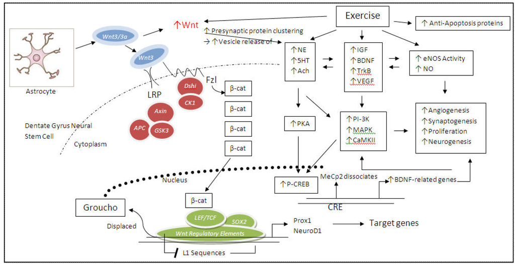 Exercise activates a wide variety of intracellular signal transduction pathways to promote neurogenesis of granule cells from neuroprogenitors in the dentate gyrus. Specifically applicable to neurogenesis, Wnt is released from neighboring astrocytes in a paracrine fashion, whereupon exercise increases Wnt signaling. Wnt binds its fzl receptor, complexed with LRP, and leading to the activation of Dshi, which, in turn, inactivates GSK3. The resulting accumulation of β-catenin (β-cat) in the cytoplasm and nucleus then binds to, and displaces, the gene regulatory proteins, LEF/TCF and Sox2 and the co-repressor, Groucho. β-Catenin then acts as a co-activator, and with transcription factors Prox1 and NeuroD1, stimulates the transcription of Wnt target genes. In addition, exercise also lifts the repressive MeCp2, thereby enhancing transcription. Normally, in the absence of exercise, Wnt3/3a is sent to the noncoding region of the granule cell, where L1 mobile elements are repressed during adult neurogenesis. Because L1 sequences contain the Wnt-regulatory element, the nearby genes can be indirectly up-regulated when the β-catenin/TCF-LEF complex is activated via Wnt signaling. In addition, exercise increases Wnt activity, leading to increased presynaptic protein and vesicle clustering, in turn leading to increased release of various neurotransmitters (norepinephrine, serotonin). Through a dizzying array of receptor and pathway cross-talk, these neurotransmitters, via GPCR signaling, can not only directly activate downstream PKA and subsequent transcription factor, CREB, thereby leading to the transcription of BDNF and related neurotrophic genes, but also activate other trophic factors (IGF-1, VEGF), thereby, in turn, activating a variety in intracellular signaling survival pathways (PI-3K, MAPK, CamKII), while simultaneously inhibiting apoptosis and inducing eNOS. Thus, both the Wnt regulatory element and the cAMP-response element (CRE) may participate (synergistically) to promote synaptogenesis, angiogenesis, proliferation, and neurogenesis.
