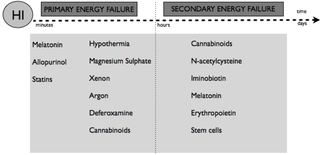 Neuroprotective therapies and their optimal moment of administration, according to their mechanisms of action. In this sense, pharmacological antioxidant therapies such as melatonin, allopurinol, hypothermia or magnesium sulfate could be useful just after the HI event. After the reperfusion, when the secondary energy failure takes place, other therapeutic options like cannabinoids, erythropoietin or iminobiotin, which have anti-inflammation and anti-apoptotic effects, could be promising therapies.