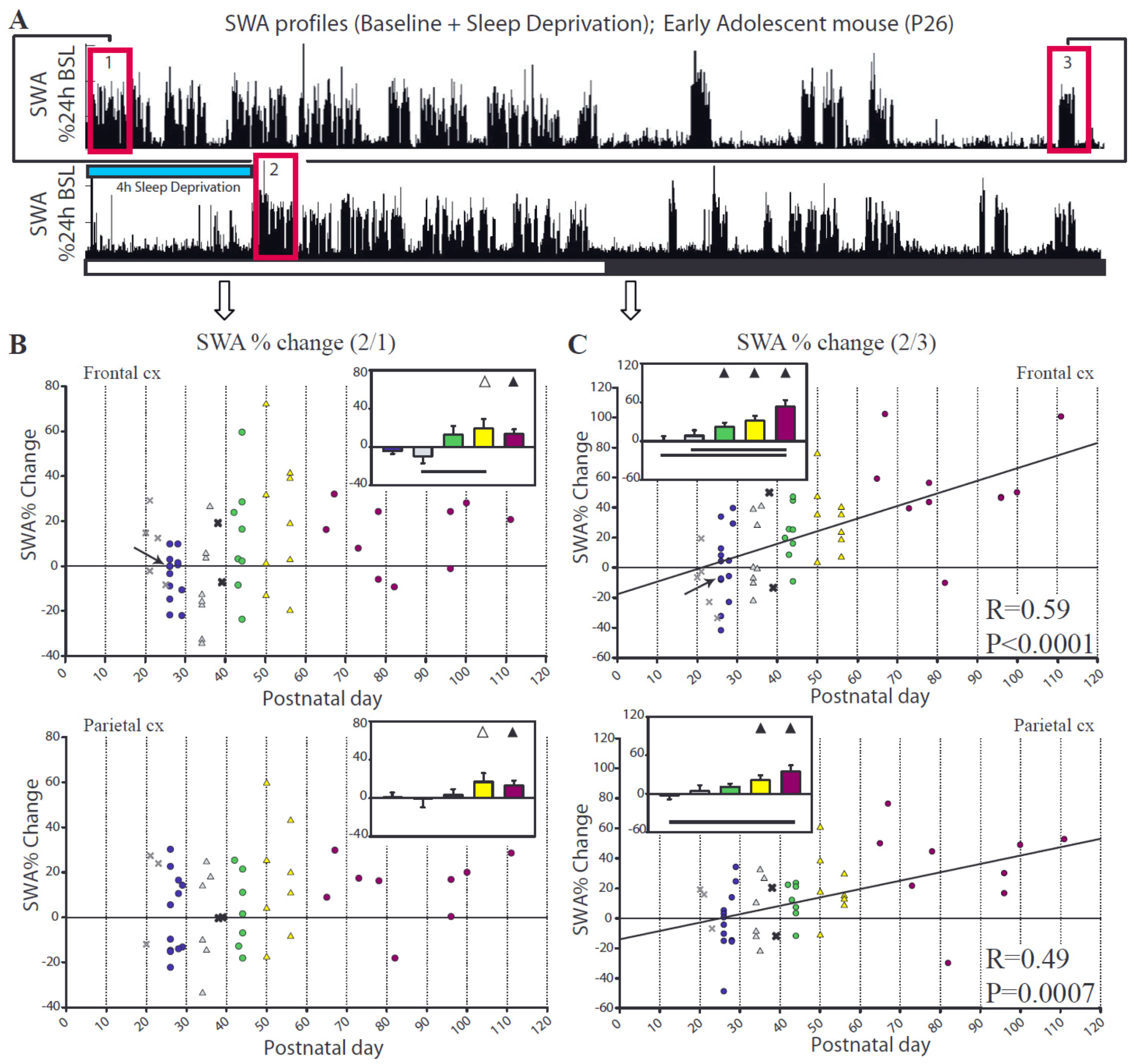 Figure 6. Change in NREM SWA after sleep deprivation. Each faint “X” denotes a mouse that underwent a 2 h deprivation and is included only as a reference. p and R correspond to the regression line computed from all animals except those denoted by a faint “X”. (A) shows changes in relative SWA for the frontal derivation in a representative adolescent (P26) mouse (indicated by an arrow in B,C). Boxes 1,2,3 indicate the first hour of baseline sleep during the light period, the first hour of recovery sleep after sleep deprivation, and the last hour of baseline sleep at night, respectively. The ratios 2/1 and 2/3 were used for the analysis shown in (B,C). Bars show differences between groups (Tukey’s HSD), and triangles indicate group means different from 0 (one sample, 2-tailed t-test; filled symbols p < 0.05, empty symbols p < 0.1).