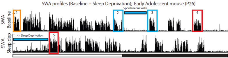 While structural and electrophysiological aspects of cortical maturation are reasonably well understood, a complete quantitative description of sleep patterns during the entire adolescence period is missing in rodents. Previous studies recorded sleep at a few select times during adolescence, and in some cases only during part of the light phase [11,13,14,15,16,17,18]. Even less characterized is how sleep homeostatic mechanisms develop and change during adolescence. Four studies have been conducted in rats sleep deprived for 2–6 h during adolescence [17,19,20,21]. Consistently, these experiments found evidence of sleep homeostasis well before weaning (as early as P12), as indexed by changes in sleep amount (e.g., increased duration of NREM sleep) and in sleep consolidation (e.g., decreased number of brief arousals) [17,19]. The same studies, however, found that only some time between the third and the fourth week of age NREM slow wave activity, the EEG power in the 0.5–4.5 Hz range during NREM sleep, becomes a reliable marker of sleep homeostasis as described in adults, increasing with time spent awake and declining with time spent asleep. The reasons for this delay remain unclear. Here we performed in mice a comprehensive study of the changes in sleep quantity and quality, as well as in the response to sleep deprivation, from early adolescence to adulthood.