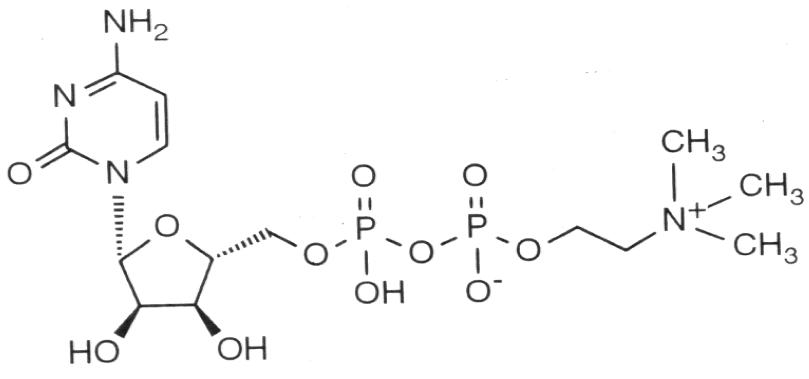 Chemical structure of citicoline, showing cytidine on the left and diphospho-choline (trimethyl-ethanol-ammonium) on the right. Cytidine is a nucleoside formed by cytosine attached to a ribose ring.