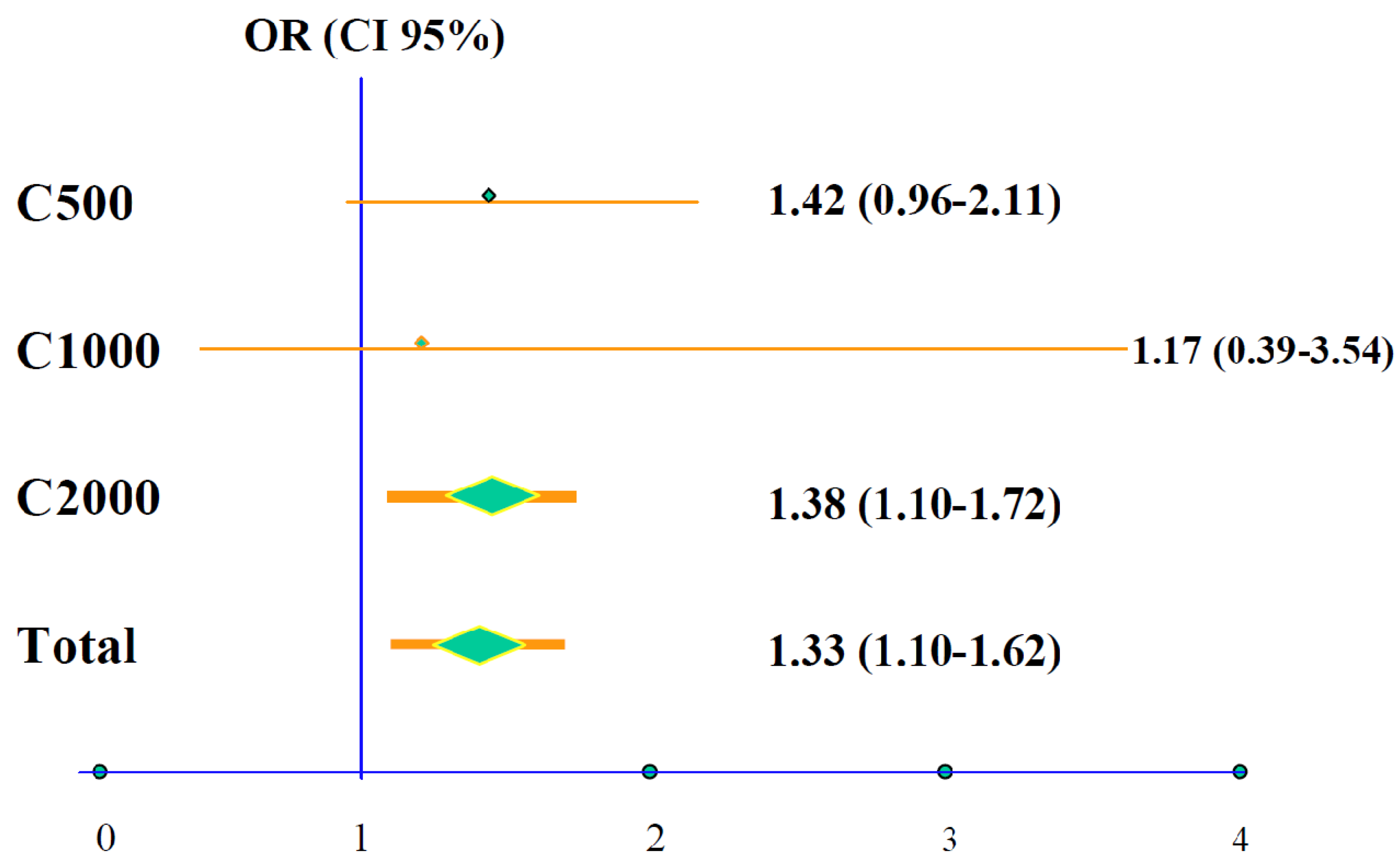 Following a comprehensive review, a total of 1372 patients were included in the data pooling analysis, 789 treated with citicoline and 583 with placebo, from four controlled clinical trials performed in the USA [55,56,57,58]. After 12 weeks of treatment 25.2% of the patients treated with citicoline presented complete recovery compared with only 20.2% of the placebo-treated cases (OR 1.33; 95% CI 1.10–1.62; p = 0.0034). As mentioned above, patients included in the data pooling analysis received three different daily doses of citicoline: 500 mg, 1000 mg or 2000 mg; the group treated with 2000 mg/day had statistically significant better prognosis with a 38% higher probability of complete recovery at 12 weeks (Figure 2) compared with those at lower doses.