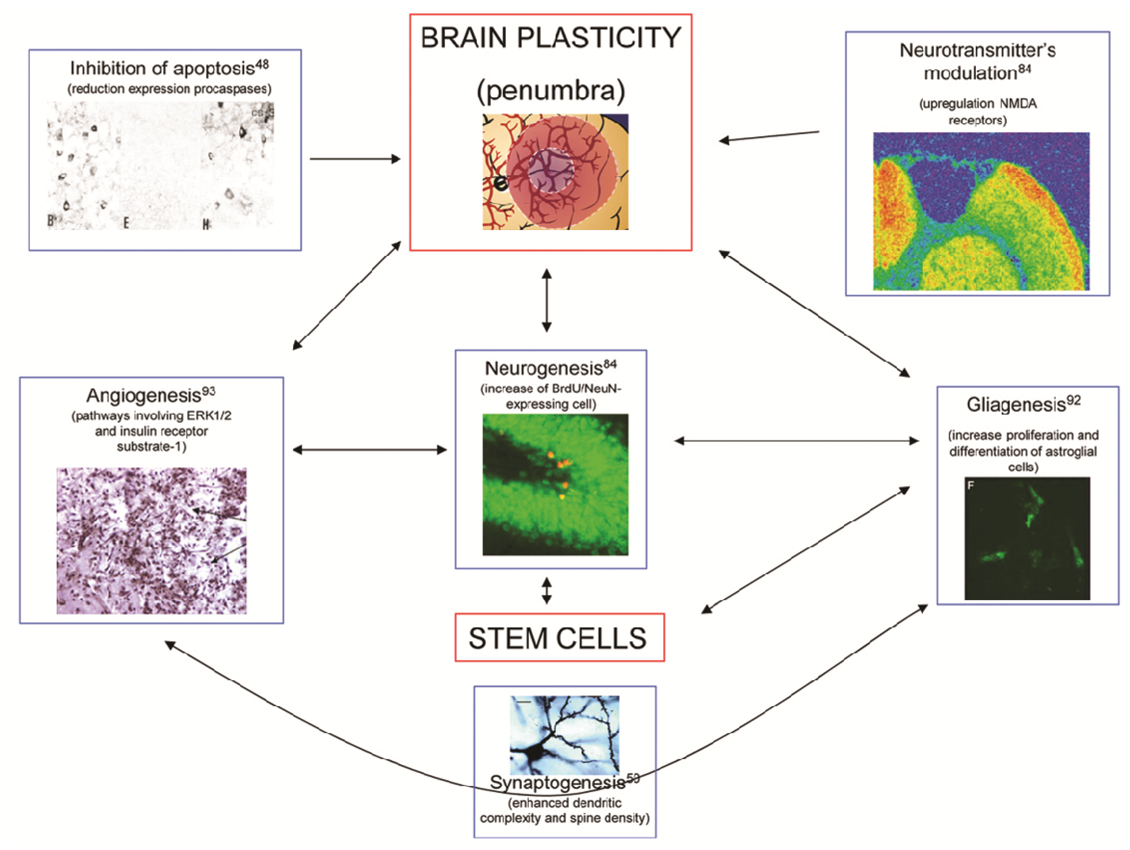 Major mechanisms involved in brain plasticity. The diagram explains the actions of citicoline to enhance the processes of inhibition of apoptosis [48], angiogenesis [92], neurogenesis [84], gliagenesis [93], synaptogenesis [50], and modulation of neurotransmitters [84]. Notice that all these effects are similar to those induced by stem cells.