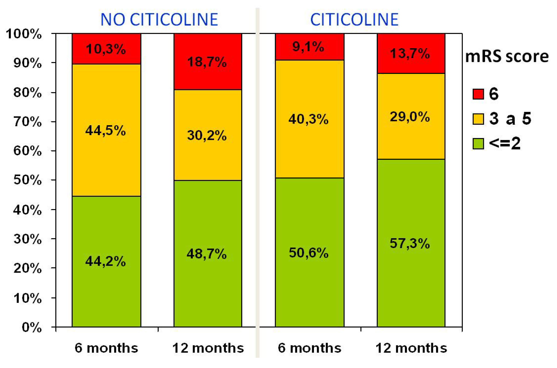 Functional status during follow-up: Notice the improvement in mRS scores (<2) at six and 12 months following stroke in the group treated with citicoline, compared with those untreated. From Álvarez-Sabín et al. [91].