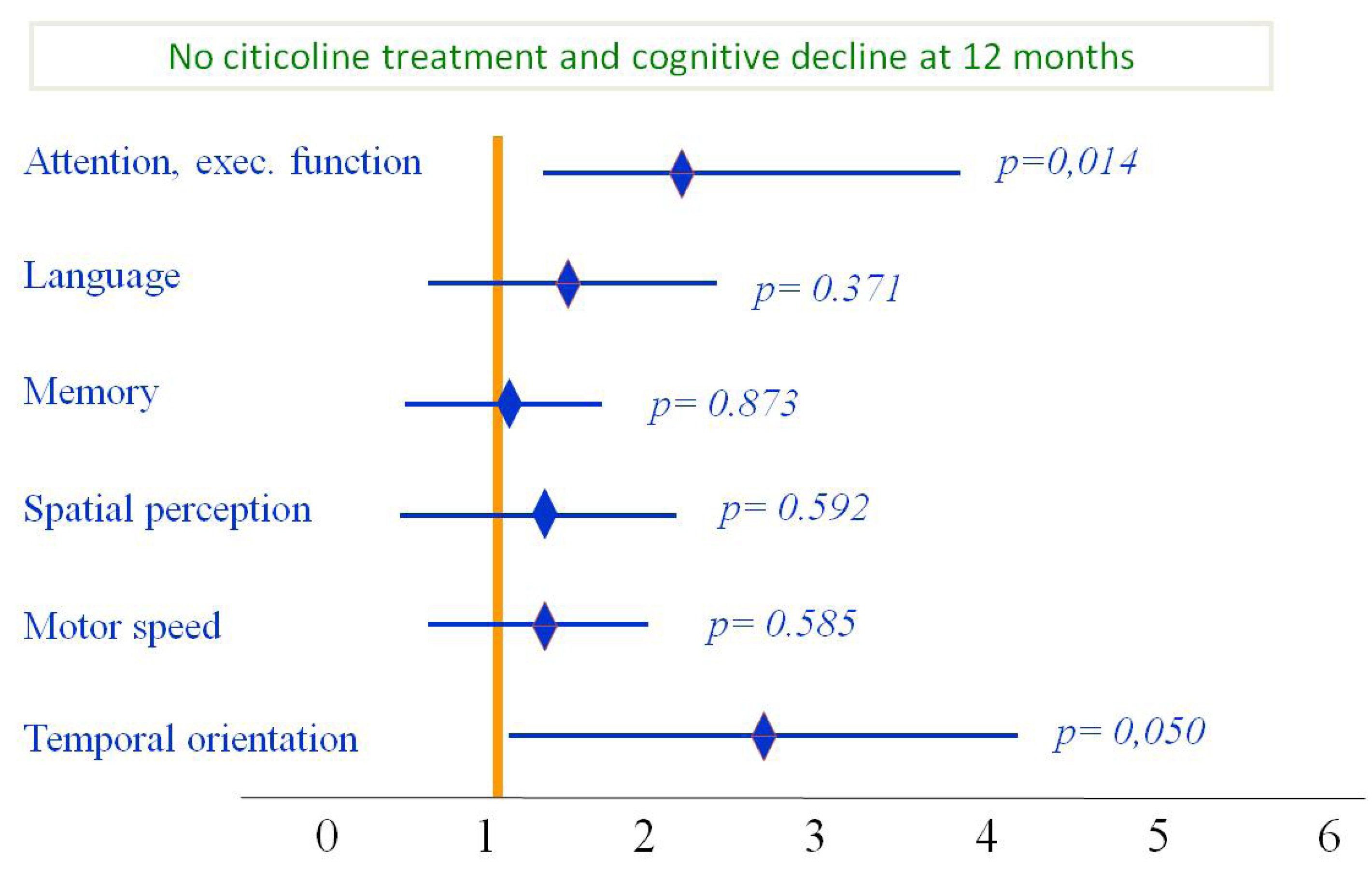 Functional status during six month follow-up: Subjects treated with citicoline had improvement on all cognitive domains; however, improvement was statistically significant only for attention/executive function and temporal orientation. Modified from Álvarez-Sabín et al. [91].