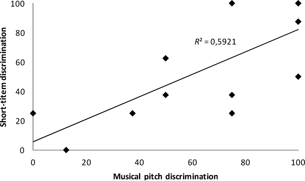 For the WS group, when we introduced musical pitch discrimination, forward digit span, vocabulary and chronological age as independent variables and scores on the short-item discrimination task as the dependent variable in the stepwise regression analysis, only musical pitch discrimination significantly predicted performance on the short-item discrimination task, F(1,12) = 17.42, p = 0.001, R2 = 0.59. This relationship is shown in Figure 1. When the same analysis was conducted with scores on the long-item discrimination task as the dependent variable, no significant predictors were found (p > 0.05). The same results were obtained when the outlier was removed from the analyses.