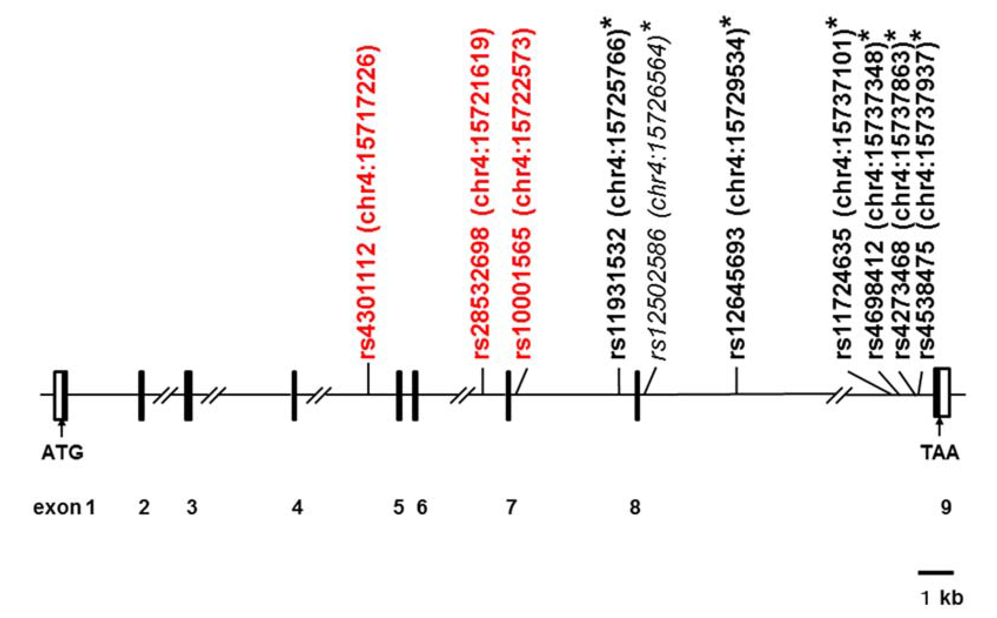 Schematic genomic structure of the human CD157/BST1 gene and locations of single-nucleotide-polymorphisms (SNPs). The exon-intron organization is depicted based on GenBank accession numbers NM_004334 and NC_000004. Black and open boxes represent protein-coding regions and untranslated regions, respectively. The SNPs (indicated in bold type) are selected from those statistically analyzed in this study; rs12502586 was not tested (plain and italicized). Red lettering represents SNPs that showed significant association with ASD in allele and/or genotype frequencies in the present study; asterisks indicate those previously reported as Parkinson’s disease-associated markers [21,23,24,25,27,28,29,30]. The locations of the SNPs on human chromosome 4 (chr4) are indicated in parentheses; numbers after colons represent genomic positions based on the human genome assembly GRCh37/hg19 at the UCSC Genome Bioinformatics Site [44].