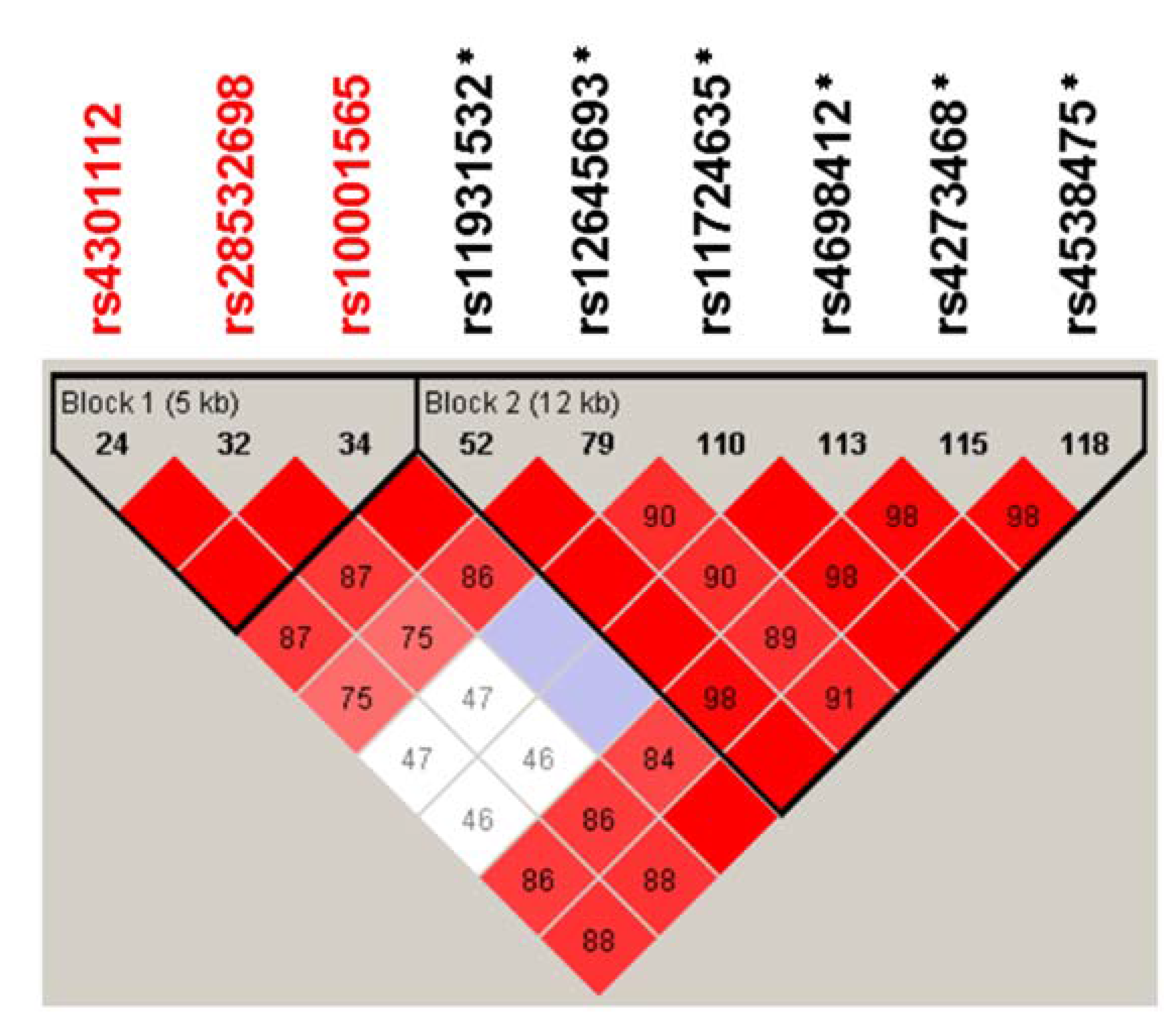 - Barrett, J.C.; Fry, B.; Maller, J.; Daly, M.J. Haploview: Analysis and visualization of LD and haplotype maps. Bioinformatics (Oxford Engl.) 2005, 21, 263–265. [Google Scholar] [CrossRef]