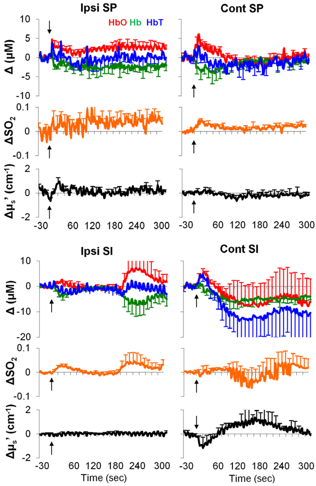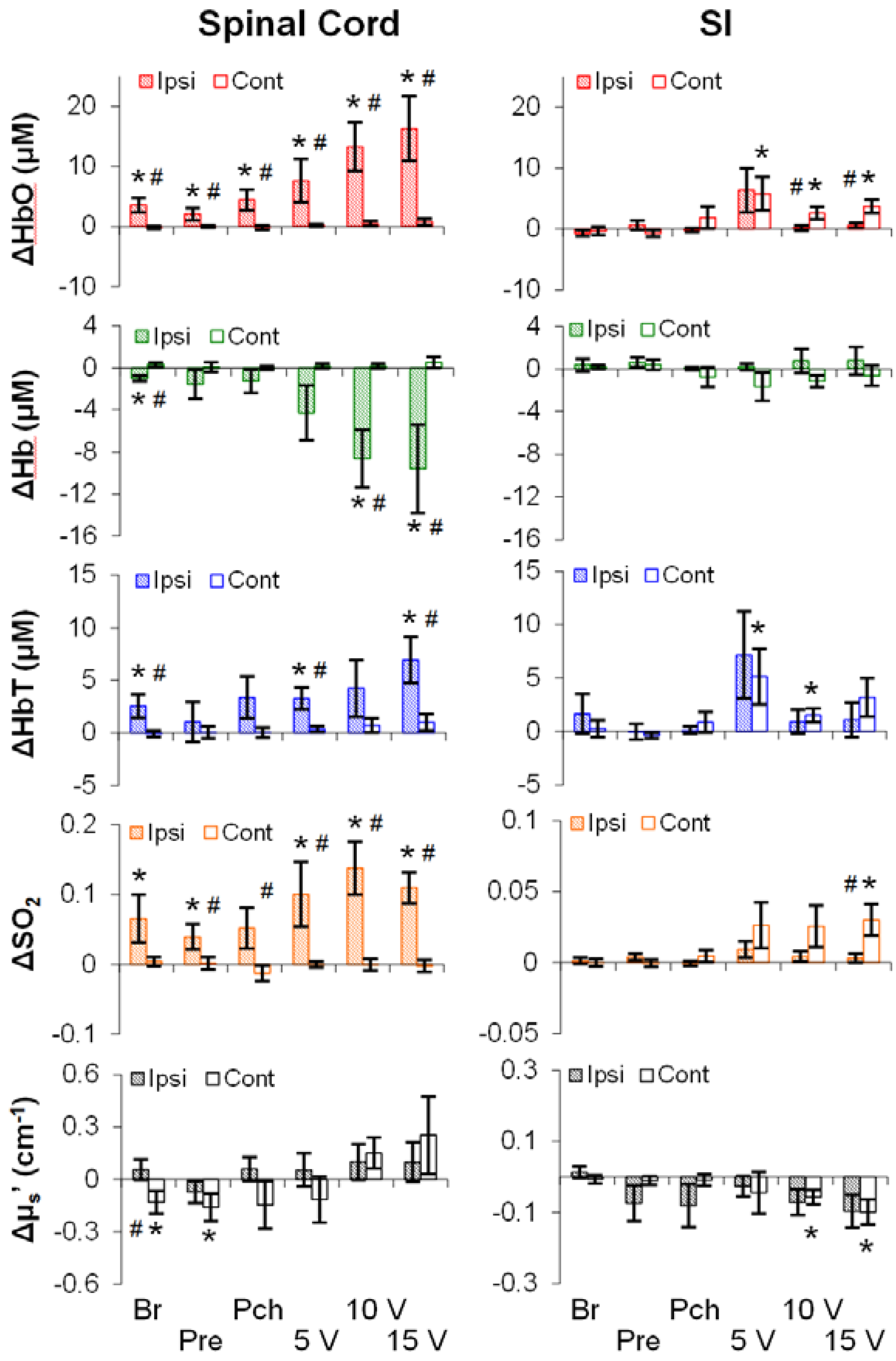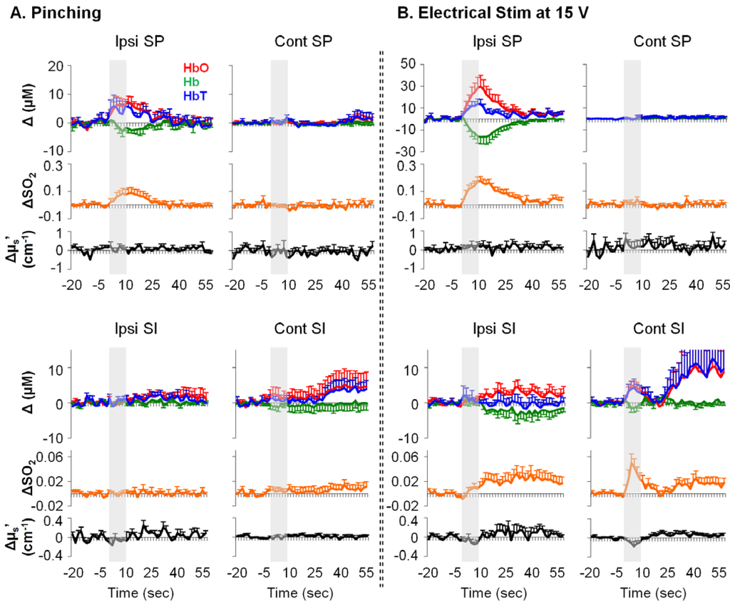 Typical examples of stimulation-induced hemodynamic and light-scattering traces from the ipsilateral spinal cord are shown in Figure 1. Examples of relative changes (after block averaging, i.e., five blocks, and baseline subtraction) are shown in Figure 2. In particular, the ipsilateral spinal cord tended to show longer (~30 s) responses in HbO, Hb, HbT and SO2, whereas the contralateral SI tended to show shorter (~10 s) responses in HbO, HbT, SO2, and μs′.
