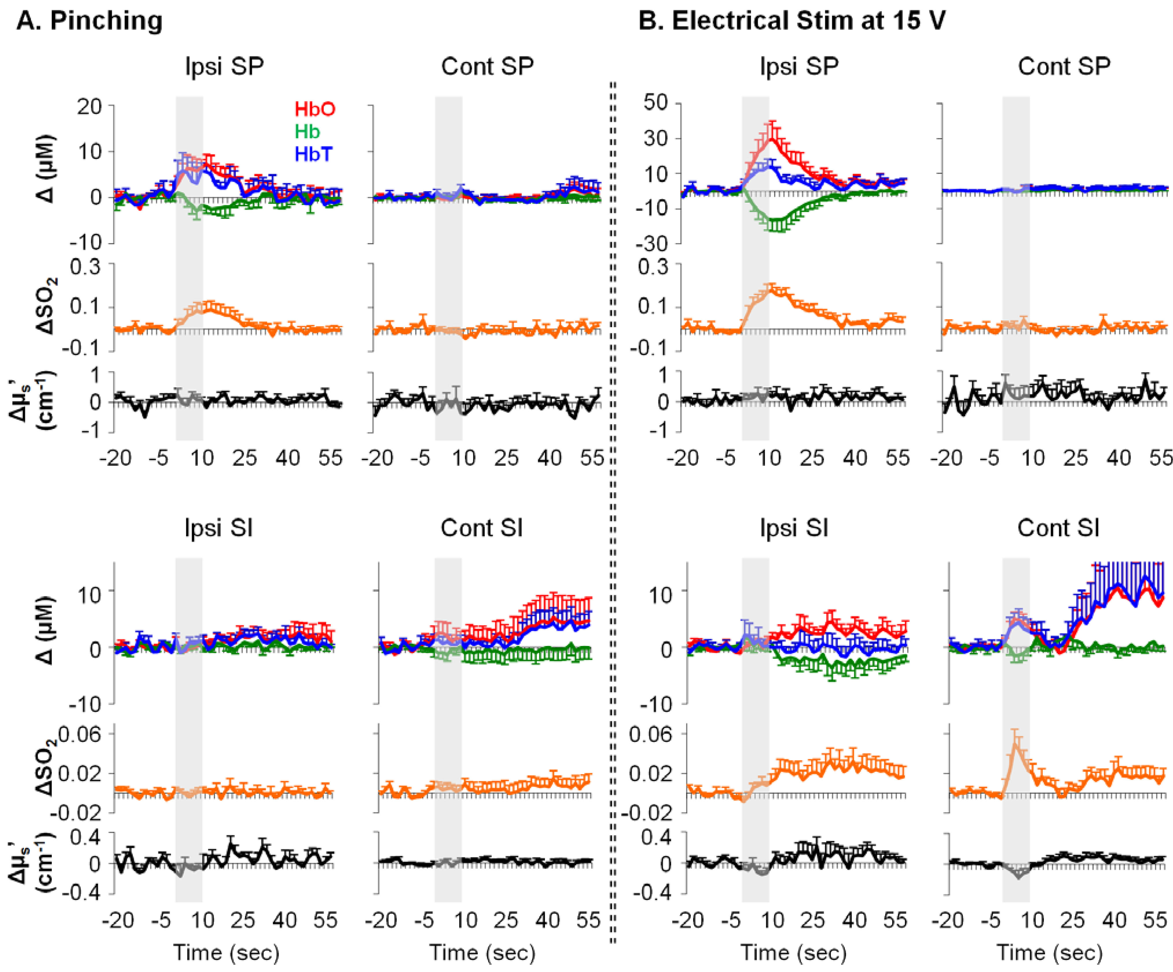 Examples of relative changes in neurovascular parameters from rat spinal cord and SI in response to noxious pinching (A) and noxious electrical stimulation ((B); n = 10). Ipsi/cont: ipsilateral/contralateral; SP: the spinal cord. Error bars: SEM. Grey bars: 10-s stimulation period. Δ: relative change from baseline.