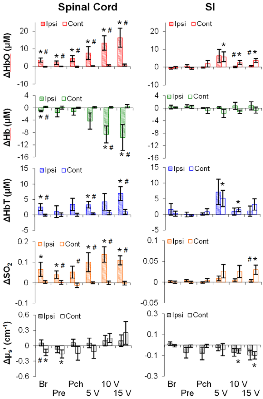 To investigate the effects of stimulus modality (mechanical or electrical), intensity (low, medium, or high), and region (the SI or the spinal cord) on hemodynamics as well as on the light scattering, averages of representative time periods (30 s for the spinal cord; 10 s for the SI) were used. As shown in Figure 3, all five parameters (rows) showed stimulation-induced changes along the somatosensory pathway (i.e., the ipsilateral spinal cord and/or the contralateral SI). Surprisingly, the stimulation-induced changes did not always occur even at the highest intensity of stimulation. That is, the stimulation-induced changes were not merely dependent on intensity, but on other factors such as region and modality. For instance, the ipsilateral spinal cord was responsive to both modalities, whereas the contralateral SI was responsive to only electrical stimuli. In addition, the spinal cord was more likely to show a change in Hb than the SI. Finally, both regions showed a decrease in μs′, despite no consistency in intensity, modality or lateralization.