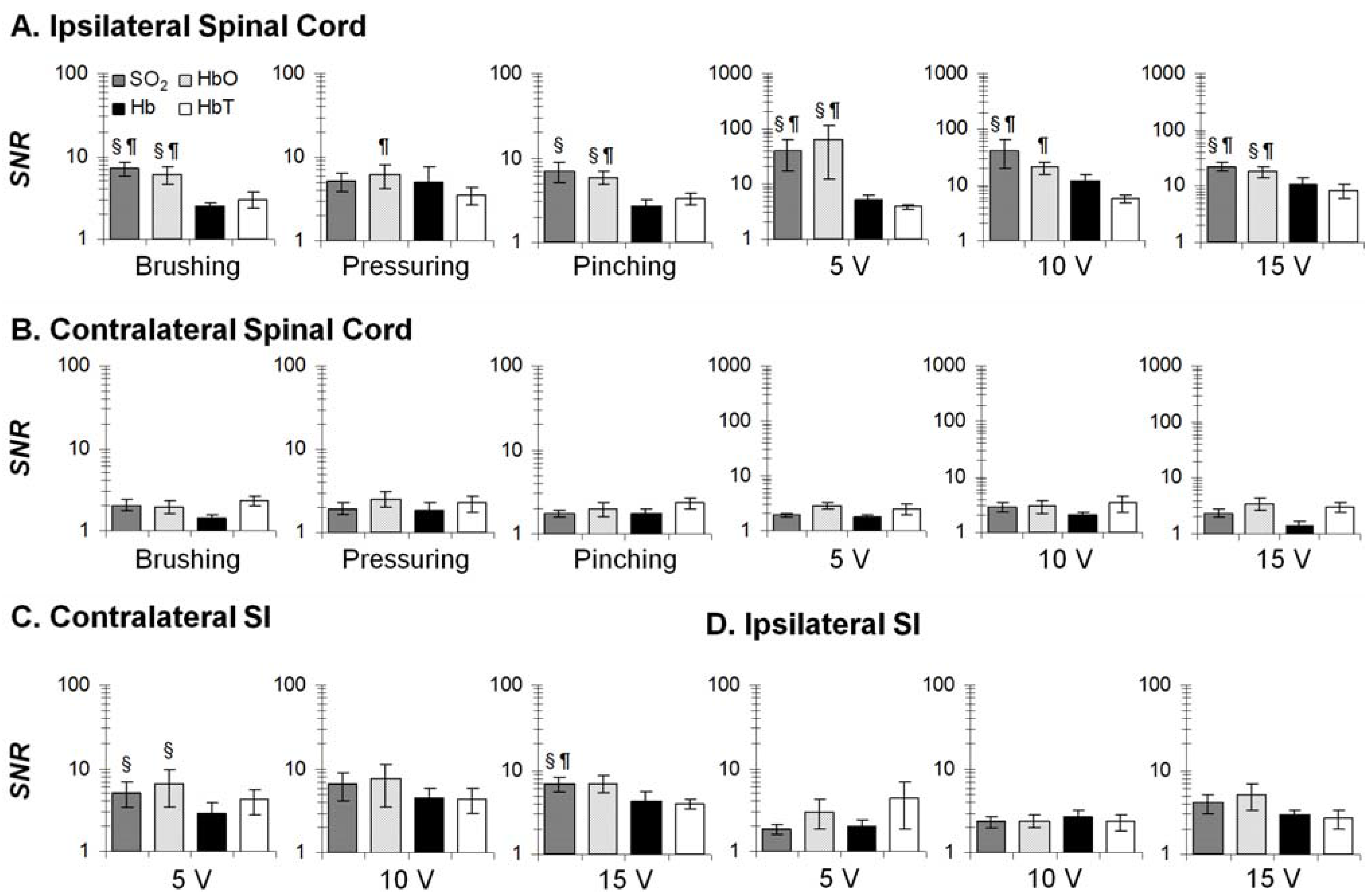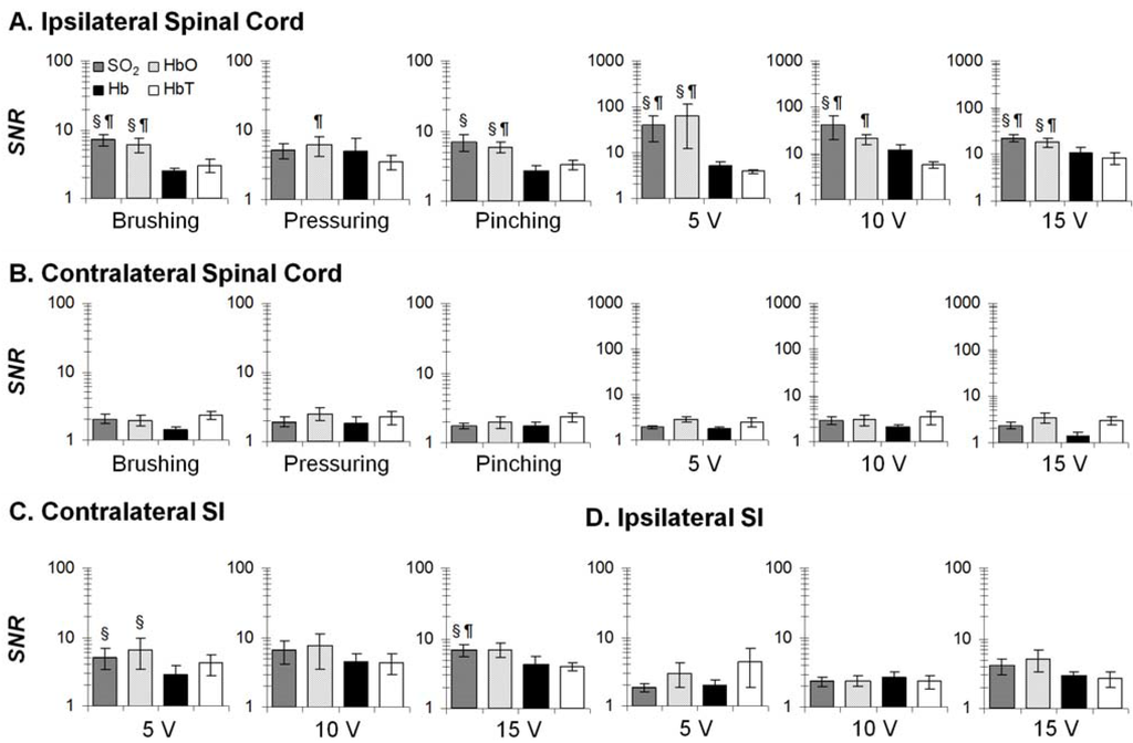 SNR of hemodynamic parameters (n = 10) at four conditions: ipsilateral spinal cord (A); contralateral spinal cord (B); contralateral SI (C); and ipsilateral SI (D). Four comparisons: SO2 vs. Hb; SO2 vs. HbT; HbO vs. Hb; HbO vs. HbT. §: p < 0.05 against Hb; ¶: p < 0.05 against HbT. Error bars: SEM.