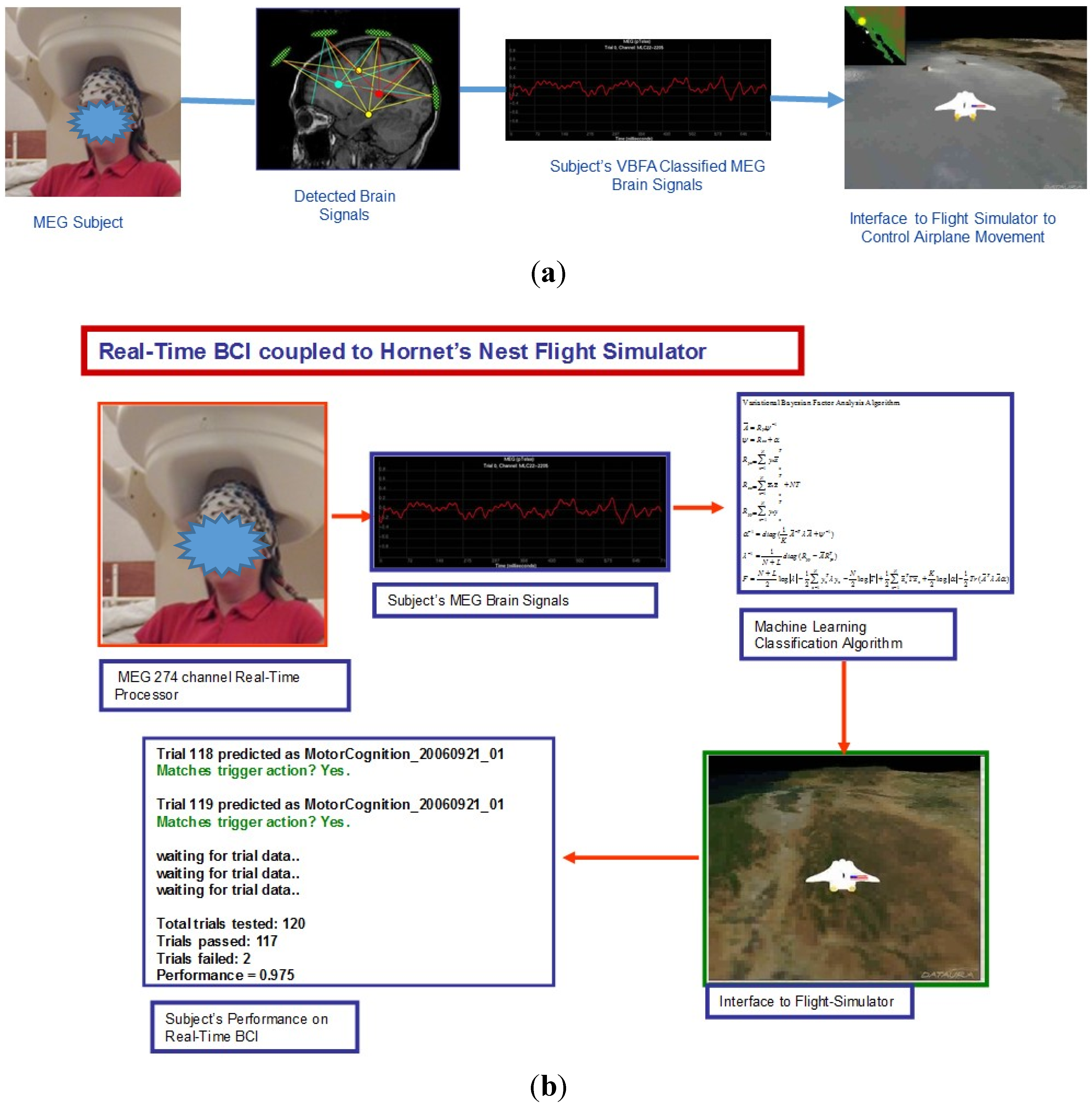 (a) MEG Brain Signals Classified with VBFAPerformer and Interfaced to Flight Simulator; (b) Real-Time BCI performance of predicted right and left thought-movement responses.