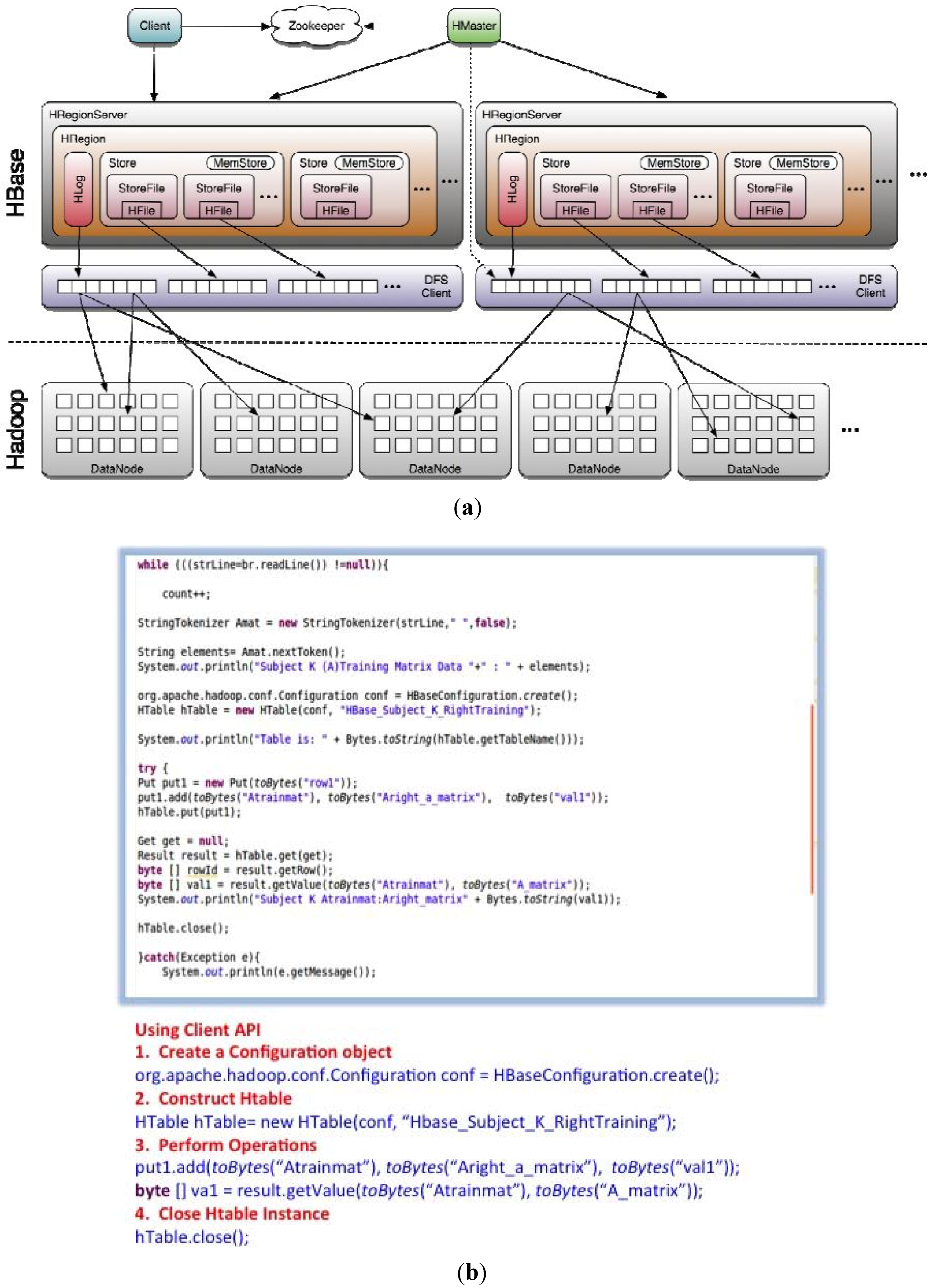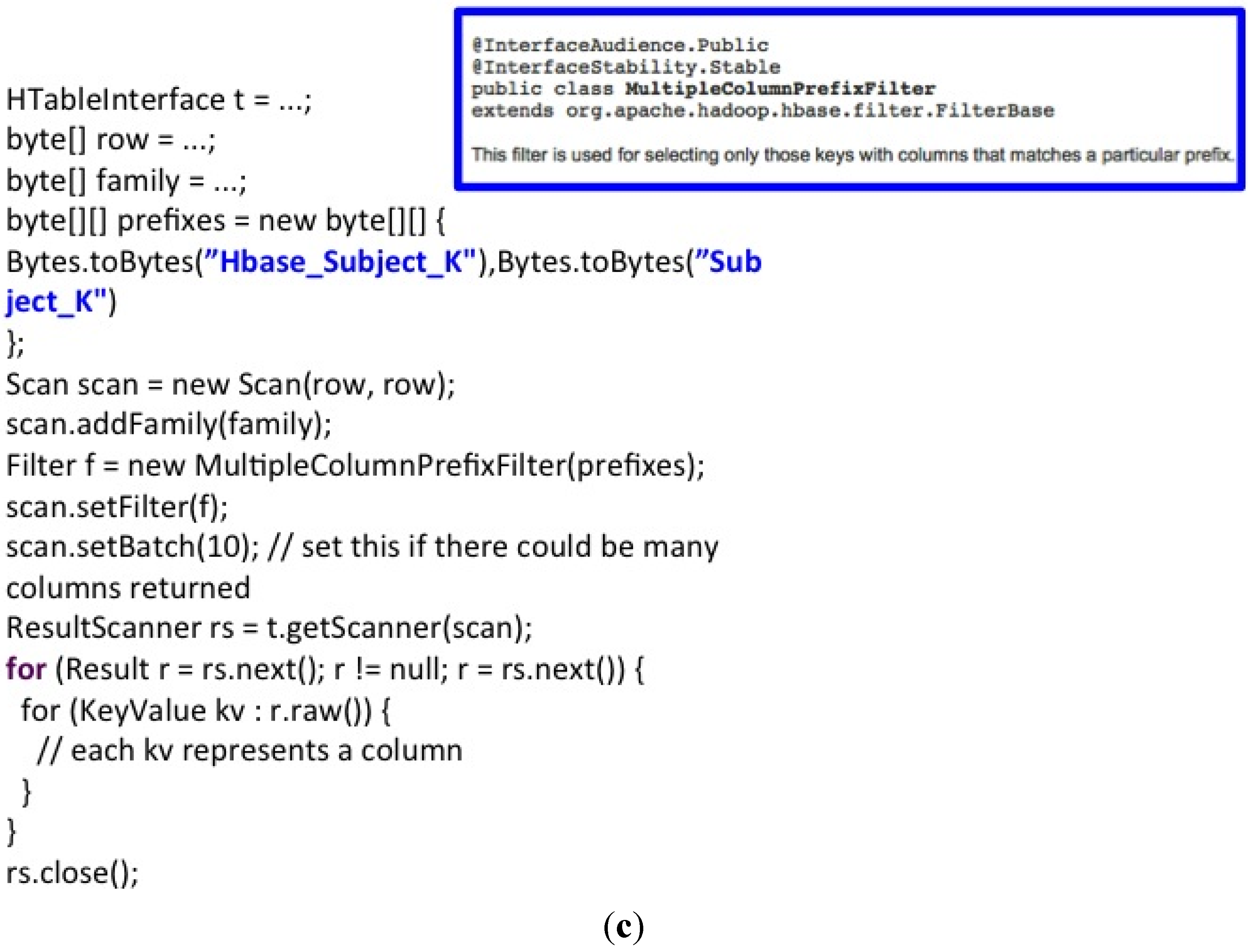 (a) HBase built on top of HDFS; (b) Java Client API of Subject K information into HBase; (c) Java Client MultipleColumnPrefixFilter of Subject K information into HBase.