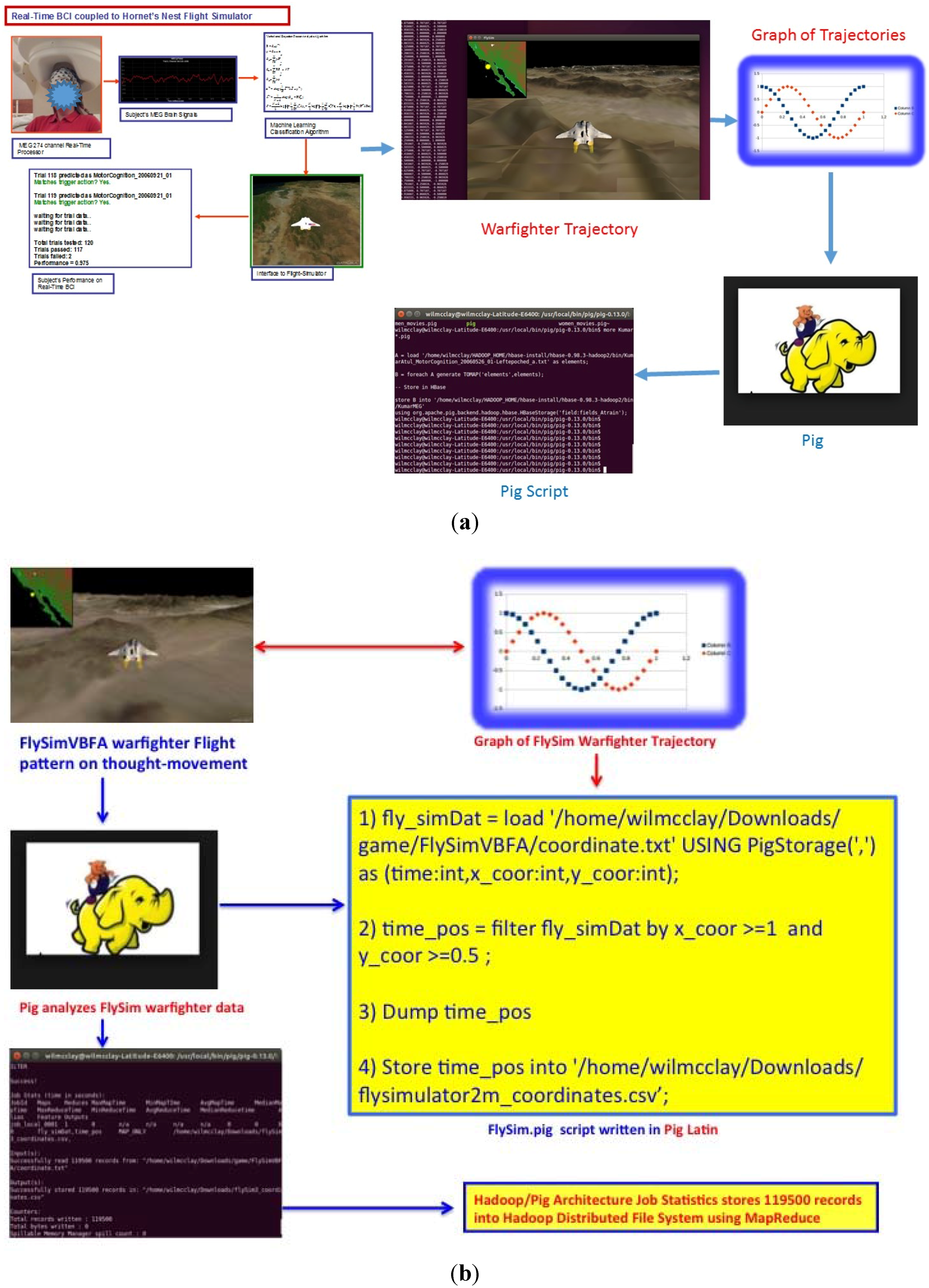 (a) Pig Scripts to analyze the warfighter’s trajectory based on subject’s thought movement; (b). A step-by-step analysis of the FlySimVBFA.pig script with MapReduce storing 119,500 warfighter trajectory records into the Hadoop Distributed File System.