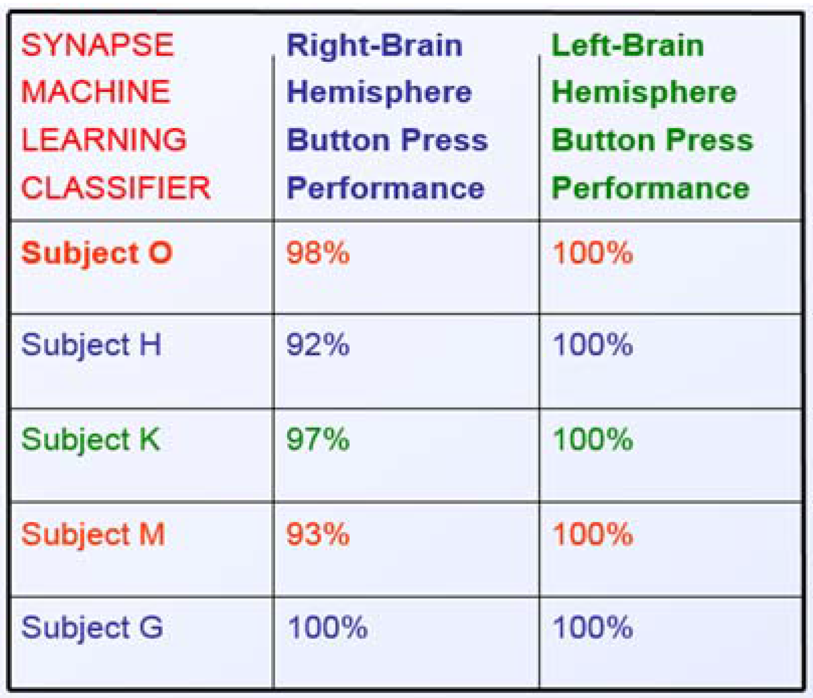 The accuracy of the real-time brain-machine interface is determined by comparing the actual thought responses of the subject to the predicted responses of the BCI. During a test session, the subject was equipped with left and right trigger buttons to be pressed in conjunction with the subject’s thoughts on moving left or right. These trigger bits are stored in a separate channel of the brain signal data. Real-time performance is computed by comparing these left or right trigger values with the predicted left or right responses (Figure 4b).