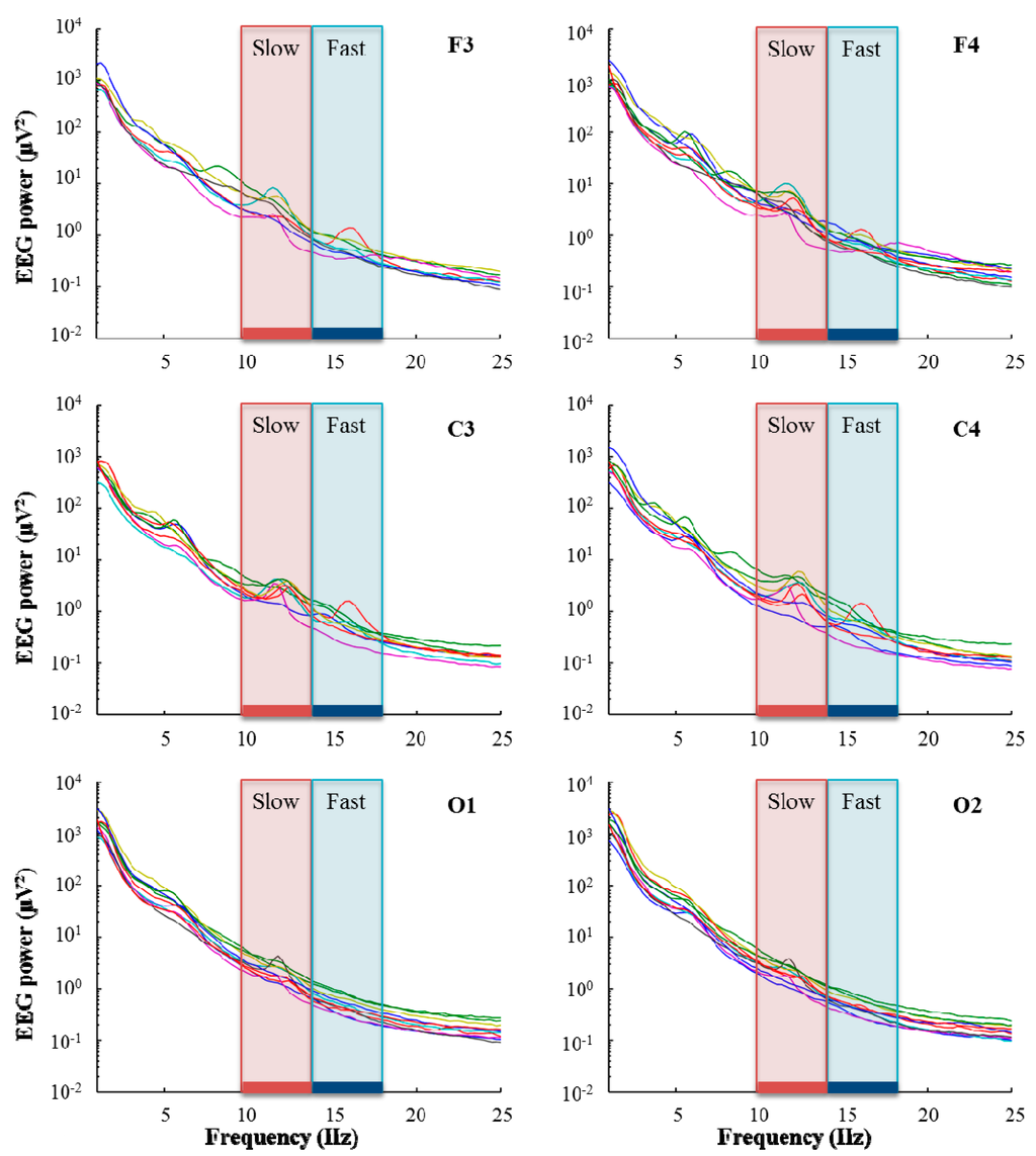 EEG power spectra during NREM sleep (n = 10). Electrodes F3, F4, C3, C4, O1 and O2 for the longest common duration (3.23 h) of artifact-free NREM sleep Stages 2 and 3. Based on the occurrence of individual peaks in EEG power, slow sigma frequency (red) was determined as 10–13 Hz and fast sigma frequency (blue) as 13.25–17 Hz. Data underwent artifact exclusion (see Experimental Section); channels excluded for subjects are not illustrated here.