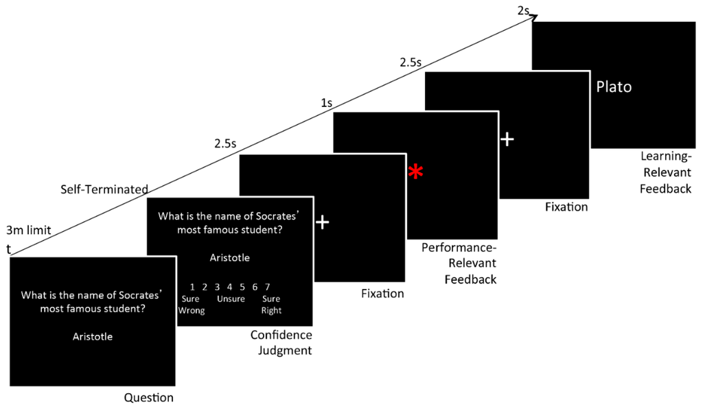 The general knowledge trial sequence used on the first day is represented in Figure 1. Questions were presented one at a time and subjects were asked to provide their best response within a 3-min time limit. If they did not know an answer to a question they were prompted to type their best guess, or otherwise wait out the full duration of the time limit, after which they would be marked incorrect. Stimuli were taken from a pool of 434 general knowledge question-answer pairings tapping a wide variety of academic domains, including the natural and physical sciences, U.S. and world history, music and art history, literature, geography, and religion. All correct answers were one word, 3–12 letters in length. The mean difficulty of all questions in the pool was 35% correct, as specified from a norming study previously undertaken to determine the free response accuracy rate of each question within the Baruch College undergraduate population. In that study, each correct answer was rated as being a familiar word to at least 95% of the normative sample.