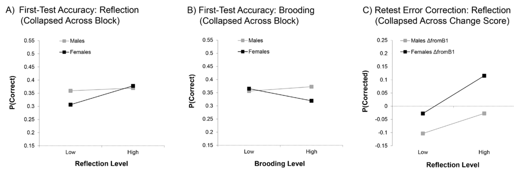 As can be seen in the Figure 2A,B, females who were lower on trait Reflection and higher on trait Brooding exhibited lower retrieval success at first-test compared to males. For males, in contrast, RRS subscores had little bearing on performance.