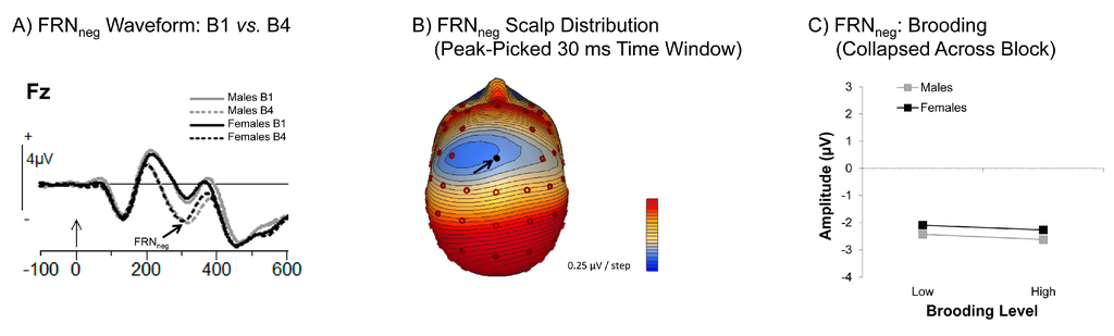 Feedback-Related Negativity in response to errors (i.e., FRNneg). (A) FRNneg grand mean waveforms plotted at Fz for the first (B1) and last (B4) blocks, as a function of gender; (B) Scalp distribution of the FRNneg for all subjects, collapsed over all four blocks. The arrow points to Fz, which is highlighted in black; (C) Null effects of Brooding on FRNneg amplitude.