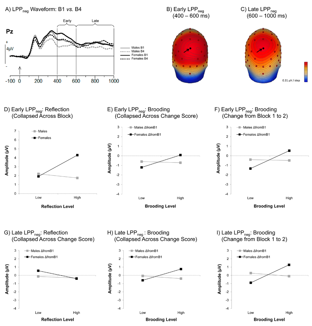 Late Positive Potential in response to errors (i.e., LPPneg) as a function of RRS and gender. (A) Early (400–600 ms) and Late (600–1000 ms) LPPneg grand mean waveforms plotted at Pz for the first (B1) and last (B4) blocks. (B,C) Scalp distribution of the LPPneg in the early and late periods, respectively, for all subjects, collapsed across all four blocks. The arrows point to Pz, which is highlighted in black. (D) Effects of Reflection on early LPPneg amplitude. Effects of Brooding on change in early LPPneg amplitudes between Block 1 and subsequent blocks (E), and during the change from Blocks 1 to 2 only (F). (G) Main effect of Reflection on late LPPneg amplitude. Effects of Brooding on change in late LPPneg amplitudes between Block 1 and subsequent blocks (H), and during the change from Blocks 1 to 2 only (I).