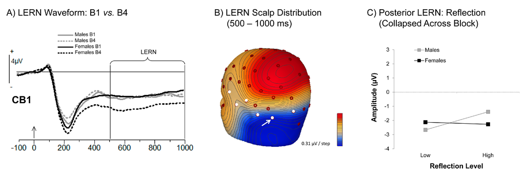 Figure 2C illustrates the simple effects for this relationship, showing that change in error correction across the task benefitted from a greater tendency toward Reflection in both genders. For females, higher Reflection scores were associated with relative improvement in error correction in later blocks relative to Block 1, whereas lower Reflection scores were associated with little change in either direction. For males, however, lower Reflection scores were associated with decline across the task, whereas for those with higher Reflection scores, little change was evident.
