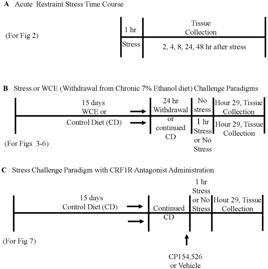 Schematics depicting experimental protocols. A: represents the acute restraint stress time course, while B: represents the stress and withdrawal from chronic alcohol and C: represents the CRF1R antagonist study.