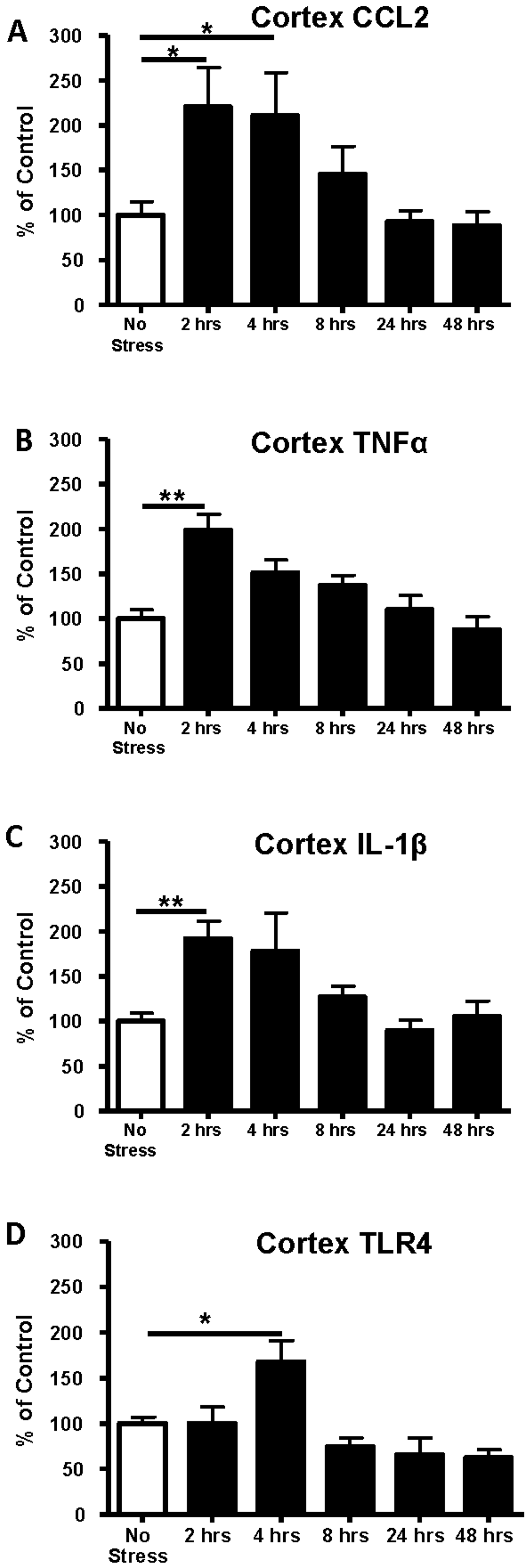 Time course of changes in cerebro-cortical mRNAs for CCL2, IL-1β, TNFα, and TLR4 following 1 h of restraint stress. Stress elevated CCL2 mRNA in cortex (F(5,32) = 3.82, p = 0.008), an effect that peaked at 2 and 4 h. A similar effect was found for IL-1β mRNA (F(5,48) = 5.13, p < 0.01) and TNFα (F(5,53) = 8.51, p < 0.0001). TLR4 mRNA was elevated at 4 h (F(5,38) = 8.5, p < 0.0001). In all cases, the cytokine mRNA levels gradually returned to control levels by 24 h. ** p < 0.01 * p < 0.05 compared with controls that received no stress (open bars). A, B, C, and D delineate data for CCL2, TNFα, IL-1β and TLR4 mRNAs, respectively, (n = 5–8 per time point)