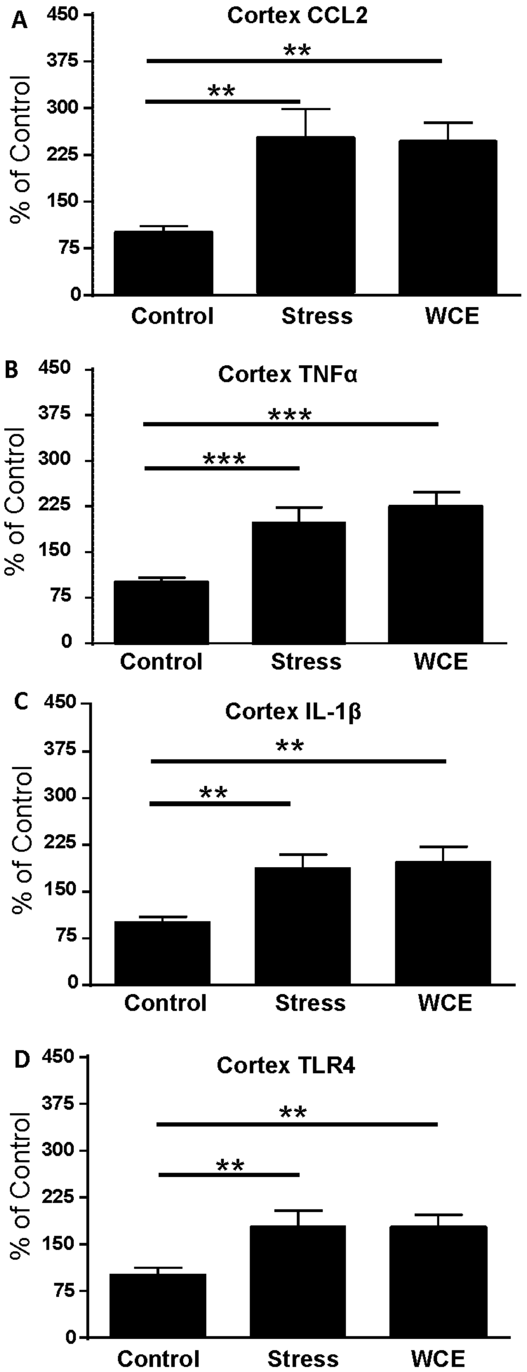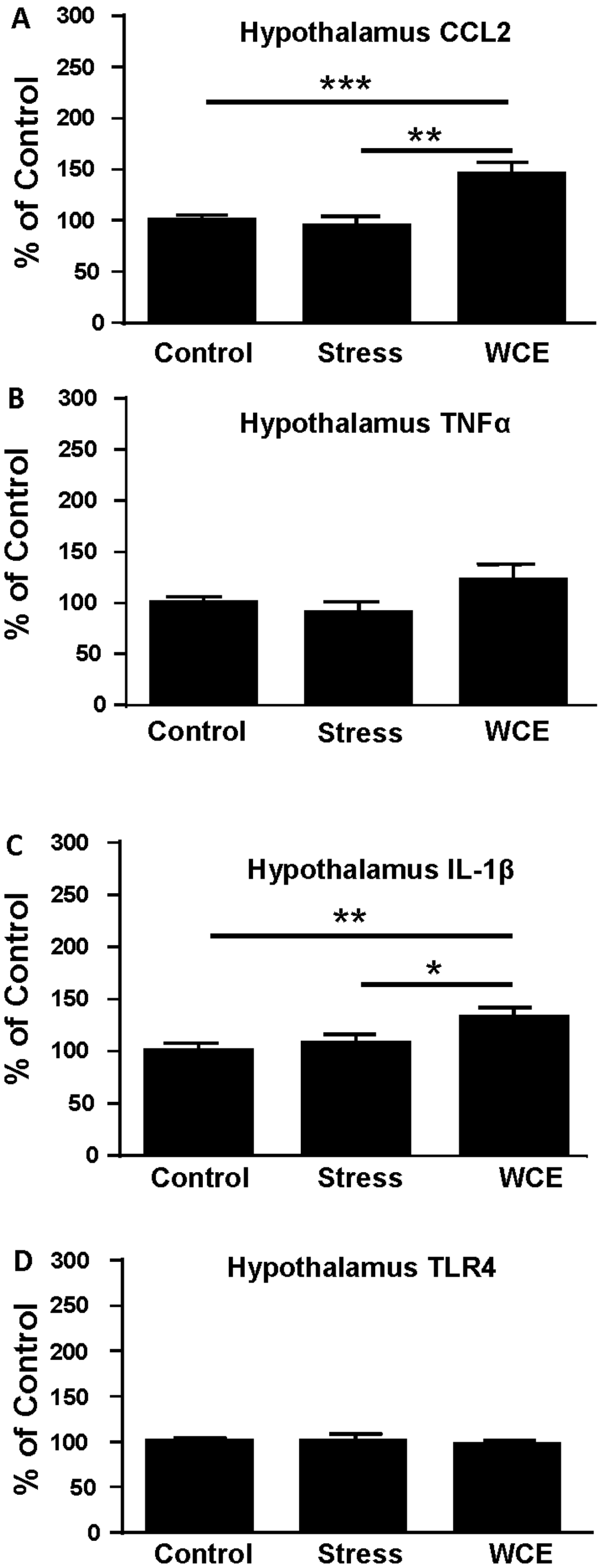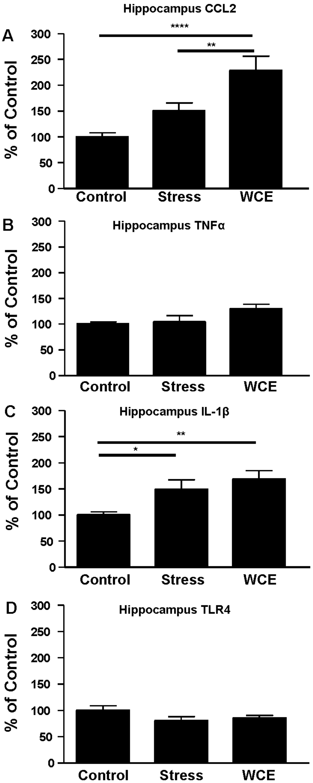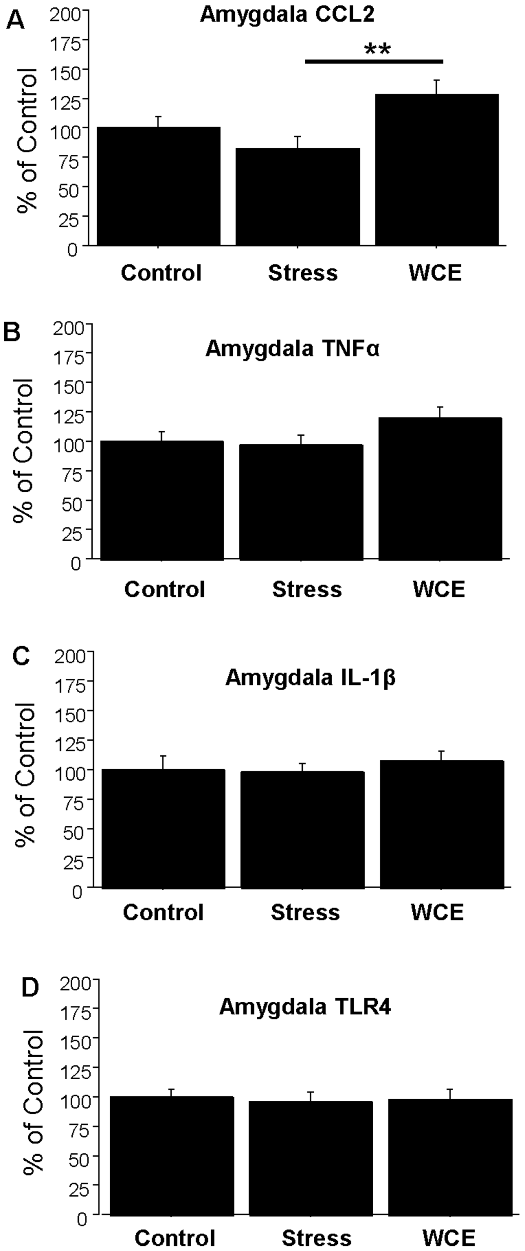 In the hippocampus, CCL2 (Figure 5A) increased with stress (by approximately 50%), but the effect of WCE was more dramatic (129% of control) and significantly higher than that for stress. In contrast, while WCE tended to increase TNFα in this region, no significant effects were found in response to stress (Figure 5B), with a similar result for TLR4 (Figure 5D). With regard to IL-1β (Figure 5C), both stress and WCE comparably induced this cytokine. Finally, in the amygdala (Figure 6), there was no effect of stress alone on any measure (p > 0.05), although WCE significantly increased CCL2 relative to stress levels.