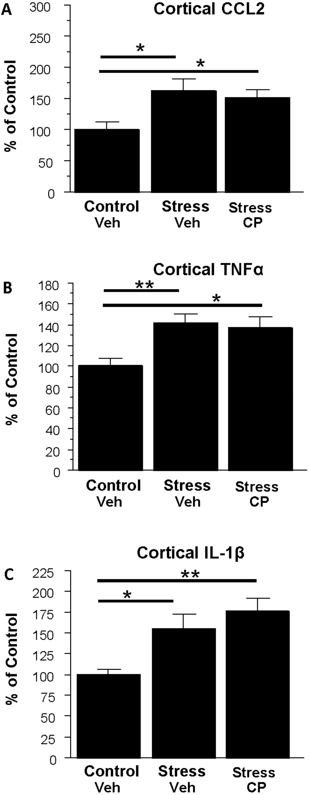 Having twice shown previously that at CRF1R antagonist blocks cytokine induction arising during ethanol withdrawal in the cortex [38], the final experiment focused on determining whether the drug would also block the induction due to stress. Figure 7 illustrates the effect of CP154,526 on cytokine mRNAs in the cortex. Figure 7A shows that stress increased CCL2 (63%, p < 0.05) and this effect was not blocked by CP154,526. Similarly, Figure 7B shows that TNFα was increased by stress (41%, p < 0.01) and again the stress effect was unaltered by CP. Finally, the profile of action on IL-1β was similar as shown in Figure 7C which shows that IL-1β was significantly increased by stress (55%, p < 0.05) and CP154,526 failed to block this induction.