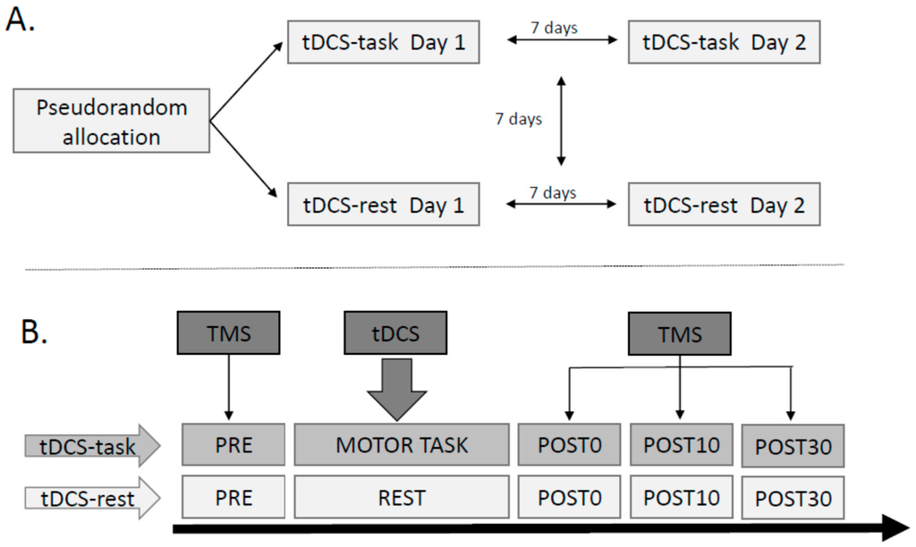 This was a repeated-measures two factorial study design in which corticomotor excitability related variables were obtained twice (test-retest: Day 1 and 2) under two stimulation conditions (Figure 1). The two stimulation conditions were: (i) anodal tDCS during a skilled motor task (tDCS-task) and (ii) anodal tDCS at rest (tDCS-rest). Each participant was tested twice under each stimulation condition (total of 4 experimental sessions per participant). All testing sessions were separated by a minimum of seven days. All four stimulation conditions were pseudo-randomized between participants to avoid order effects.