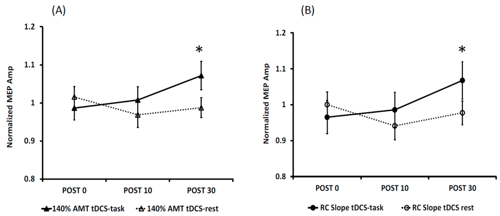 MEP areas normalized to baseline values at 140% AMT (A) and RC slopes (B) for the tDCS-task and tDCS-rest conditions. An average of Day 1 and 2 values are represented to show the significant interaction of Condition and Time. * denotes a significant difference between the two conditions at POST30 (p < 0.05).
