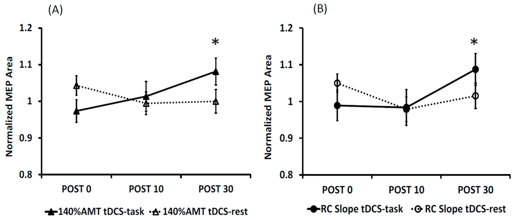 MEP area: The MEP area data showed a similar trend as MEP amplitude (Figure 3). The 3-way ANOVA revealed no significant interaction or main effects for 120% AMT and 130% AMT. The interaction effect of stimulation and time was significant at 140% AMT (F(1, 145) = 5.06, p = 0.019) and for RC slopes (F(1, 145) = 4.4, p = 0.045) (Figure 3). For 140% AMT, post hoc analyses revealed a significantly higher mean for tDCS task (9%) compared to tDCS-rest at POST30. Similarly, for RC slope, a significant higher mean was noted for tDCS-task (7%) at POST30 than tDCS-rest condition.