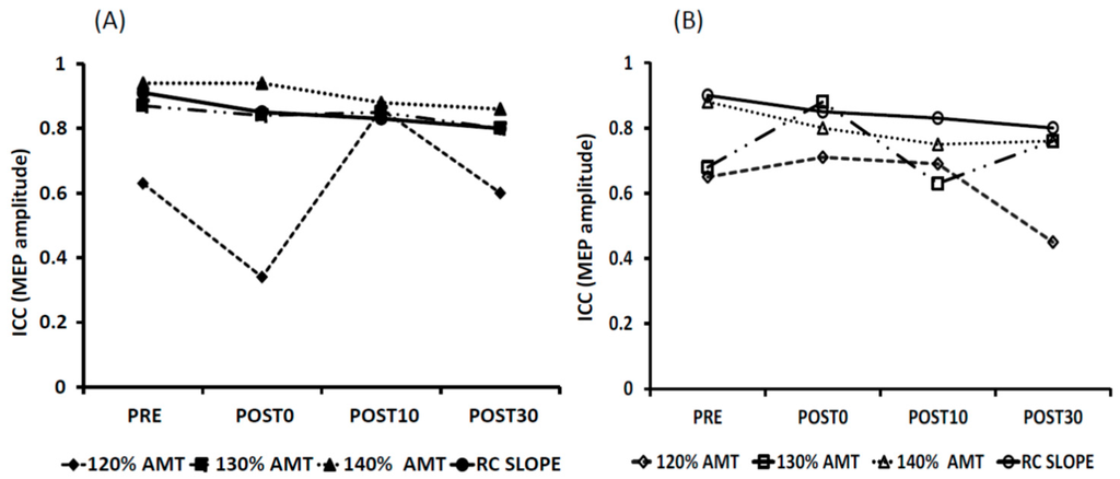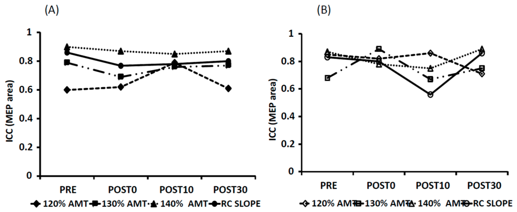 Interclass Correlation Coefficients (ICC) were used to estimate the test-retest reliability for Day 1 vs. Day 2 within each stimulation condition. ICCs were run using a two-way random analysis for absolute agreement. ICC is the ratio of between-subject variation to the total variation, and it is the statistical measure most adopted for quantifying test-retest reliability [23]. ICC scores ranges from 0–1 with a value of 1 indicating perfect reliability, ≥0.90 considered to be excellent, 0.75–0.89 to be good, ≤0.74 to be moderate, and below 0.5 to be poor. ICC comparisons were made for MEP amplitude and MEP area measures at selected individual intensities (120%, 130% and 140% AMT), and for linear slopes of MEP amplitude and MEP area RC curves.
