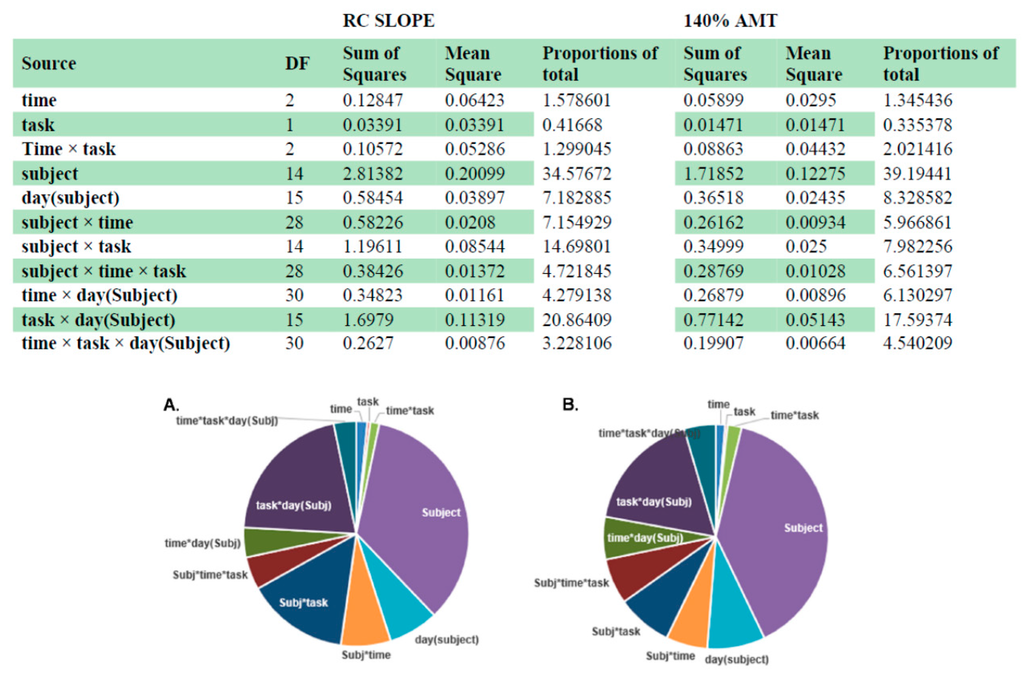 Contribution of inter- and intra-individual variability to the total variance for MEP amplitude for RC slope and 140% AMT. The table represents the degrees of freedom (DF), sum of squares, mean squares and proportions of total for each factor used in the analyses. The pie chart illustrates the proportions of total. i.e., contribution of sum of squares to the total sum of squares for RC slope (A) and 140% AMT (B).