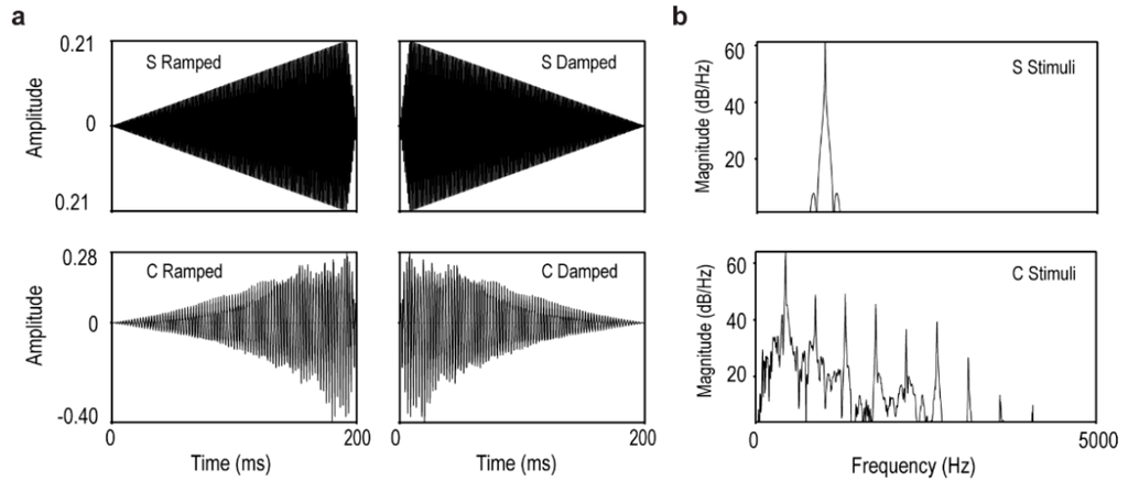 Acoustic representations of the S and C ramped and damped stimuli. (a) Sound waveforms; (b) Power density spectra.