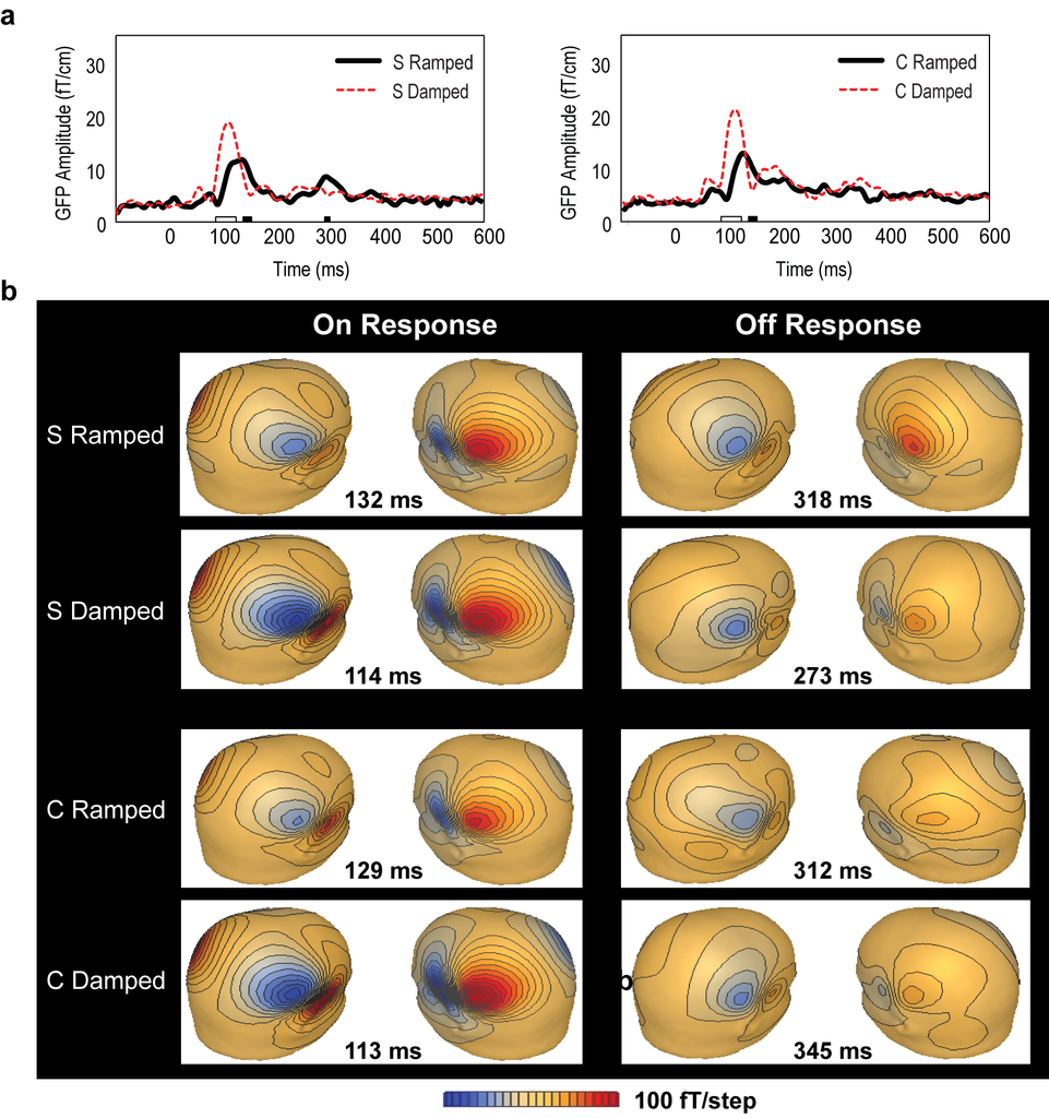 To verify the experimental hypotheses, we conducted global field power analysis as well as two source localization methods [59]. In the waveform analysis, the raw MEG data were digitally low-pass filtered at 40 Hz and corrected with a pre-stimulus baseline of 100 ms. As our interest was in the neural coding of the physical stimulus features instead of neural sensitivity in discriminatory responses, the first stimulus in each block was omitted from averaging to avoid possible elicitation of a mismatch field response to the previous block of stimuli. MEG waveform amplitude was defined as the vector sum of amplitudes at two orthogonal channels in the same sensor location. To derive a composite measure of differences in MEG activity for the averaged ON and OFF responses for the ramped and damped stimuli, we analyzed the global field power (GFP) for each stimulus and each subject. Similar to the calculation of GFP for EEG signals (e.g., [54]), the GFP is the root mean square of magnetic fields across all the 61 recording sensor sites at each time sample. The GFP measure has been shown to be an objective and reliable quantification method independent of sensor selection in EEG and MEG studies [60,61,62].