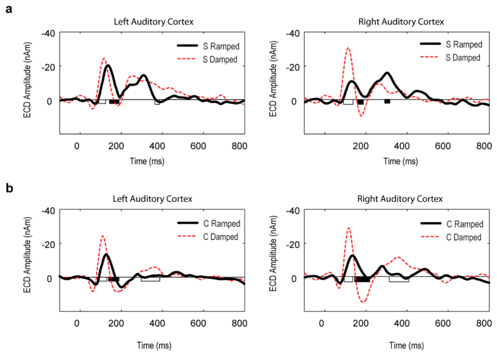 Grand mean equivalent current dipole (ECD) waveform results in the left and right auditory cortices for the ramped and damped sounds in the two stimulus conditions: (a) S stimuli; and (b) C stimuli. Significant differences between the ramped and damped sounds are indicated on the horizontal axis (p < 0.01). Intervals with larger amplitudes for damped sounds are marked by white bars on the X-axis, and intervals with larger amplitudes for ramped sounds are marked by black bars.