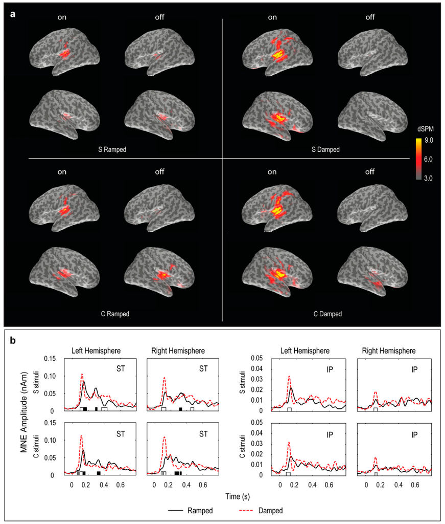 In both S and C stimulus conditions, the MNE data showed two main regions of bilateral activity (superior temporal and inferior parietal) for the ON response (Figure 4). In both superior temporal (ST) and inferior parietal (IP) regions, there was a significant effect of response type (on vs. off) with larger ON response than OFF response (F(1, 5) = 18,28, p < 0.01 for ST; F(1, 5) = 18,84, p < 0.01 for IP). The ON responses were greater for the damped sounds than those for the ramped sounds in the ST and IP regions, which was further confirmed in separate post-hoc t-tests for each hemisphere and each stimulus condition (p < 0.05).