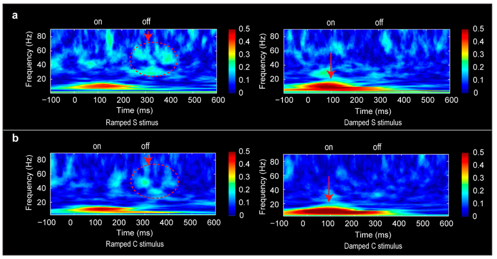 Grand mean phase locking factor results for the S stimulus condition (a) and C stimulus condition (b). Enhanced gamma band activities associated with the OFF response were marked in dotted circles with an arrow assign for the ramped sounds. Enhanced theta and alpha activities associated with the ON response were indicated by the arrow sign for the damped sounds.