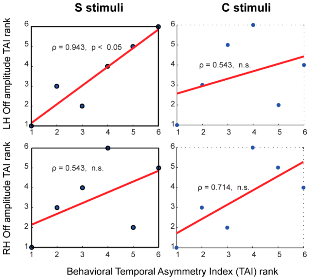 Sample scatter plots of the temporal asymmetry index (TAI) measures with Spearman rank correlation analysis. The OFF response dipole moment (amplitude) was used in calculating the neural TAI scores in the left (LH) and right (RH) hemispheres for the S and C stimuli. Full details of the brain-behavior correlate measures are reported in Table 1.