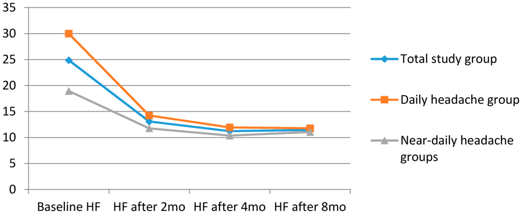 In the intention to treat analysis (ITT), headache frequency was reduced from 30 headache days per month to 12, 9, and 9 headache days per month, respectively after 2, 4, and 8 months of treatment in the DH group. Regarding NDH patients, headache days per month were reduced from an average of 19 headache days/month to, respectively, 9, 6, and 7 headache days/month. Although the difference in headache frequency was significant during baseline and after the three endpoints (p < 0.001) compared to baseline in both subsets of patients, the comparisons between headache frequencies after 2, 4, and 8 months were not different regarding these two groups (p > 0.05).