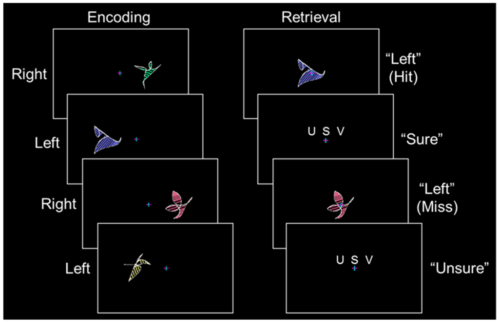 Experimental paradigm. Left, during encoding, participants viewed abstract shapes to the left or right of fixation (item types are shown to the left). Right, during retrieval, old items from encoding were presented at fixation and participants classified each shape as previously on the “left” or “right” followed by an “unsure”–“sure”–“very sure” confidence rating (possible responses and corresponding event types are shown to the right).