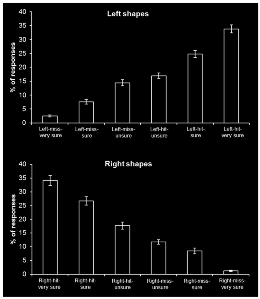 Figure 3 shows the behavioral response distributions (in percentage of responses) for each left shape and right shape event type. Of importance, the percentage of highest confidence misses were both significantly greater than zero (left-miss-very sure, t(15) = 6.61, p < 0.001; right-miss-very sure, t(15) = 4.95, p < 0.001). These behavioral findings support the continuous unequal variance model of recollection and contradict the two-high threshold model of recollection.