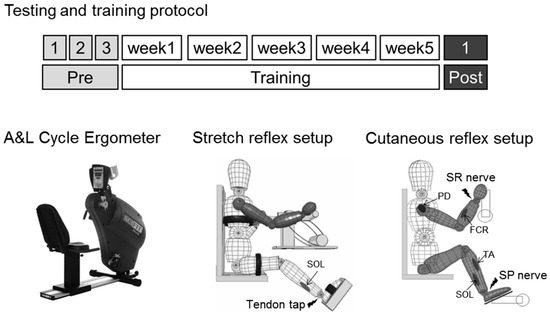 Illustration of the testing and training protocols. A multiple baseline within-subject control design was used for this study. An A & L cycle ergometer (Sci-Fit Pro 2) was used for training. The setups for stretch reflex and cutaneous reflex testing are shown. Muscles of interest are shown with a gray oval, and electrical stimulation is shown with a black lightning bolt. For the stretch reflex setup, a brief vibration was delivered to the triceps surae tendon and the reflex was recorded from the soleus (SOL) muscle, separately for each side. For the cutaneous reflex setup, simultaneous electrical stimulation was applied to the superficial radial (SR) and the superficial peroneal (SP) nerves, and reflexes were recorded bilaterally from the soleus (SOL), tibialis anterior (TA), flexor carpi radialis (FCR), and the posterior deltoid (PD) muscles.