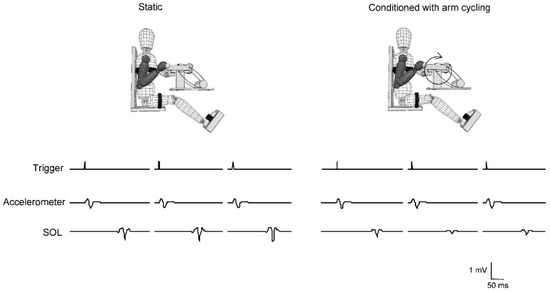 Figure 2 shows example representative traces for the shaker trigger, the accelerometer input, and for the soleus stretch reflex for the static and conditioned trial from a representative participant. Suppression due to arm cycling can be seen for the soleus stretch reflex amplitude with a constant trigger input.