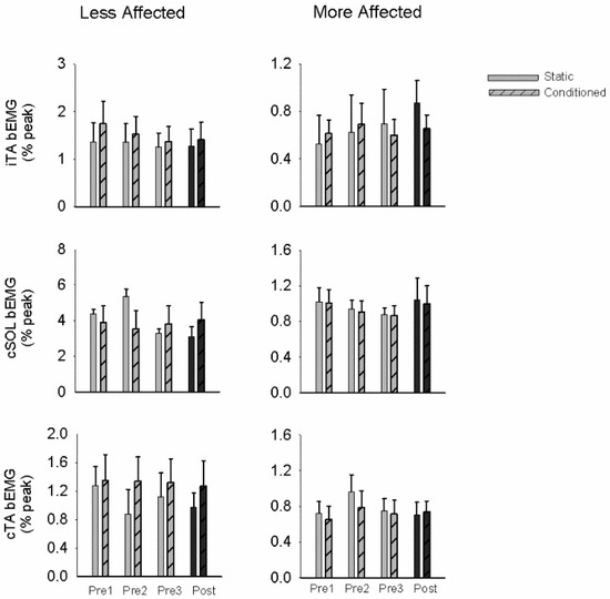 Figure 4 shows background EMG activity during testing of soleus stretch reflex amplitude modulation by arm cycling in the LA and MA sides. No significant differences were found for background EMG between the static and conditioned trials for the pretests or the post-test.