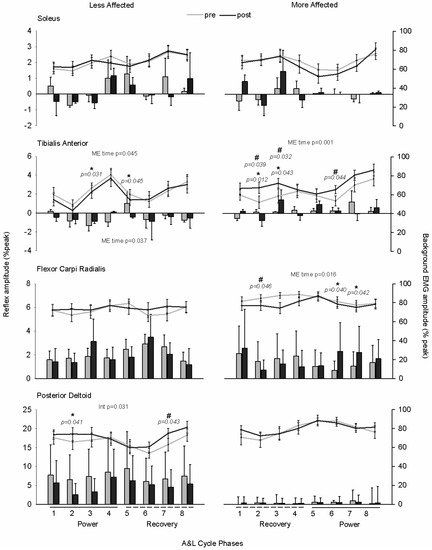 Figure 6 shows normalized background EMG (lines) and reflex amplitudes (bars) during A & L cycling. The horizontal bars below the y-axes represent the power (solid line) and recovery (dotted line) phases of A & L cycling. As there were no significant differences between pretest data samples, for simplification the average value across the three tests is shown.