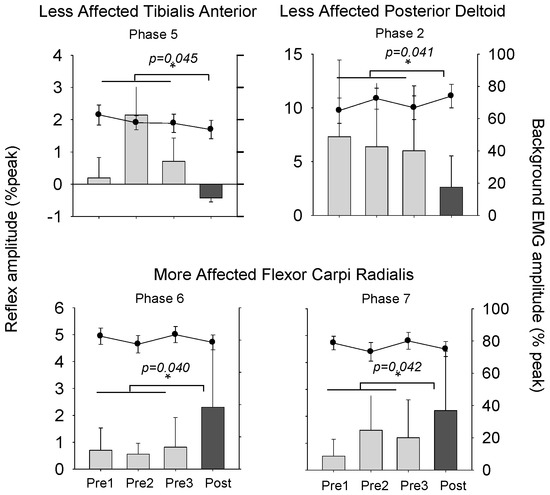 Normalized background EMG and reflex amplitudes at specific phase of interest during A & L cycling. Bar graphs are means (± standard error) for reflex amplitude averaged across all participants for baseline and post-test values. Line graphs are means (± standard error) for bEMG. Repeated-measures ANOVA was used to assess the effects of A & L cycling training with significance set at p ≤ 0.05. p-values are shown for each test. * indicates significant differences between the pretest average and the post-test value. There were no significant differences for bEMG.